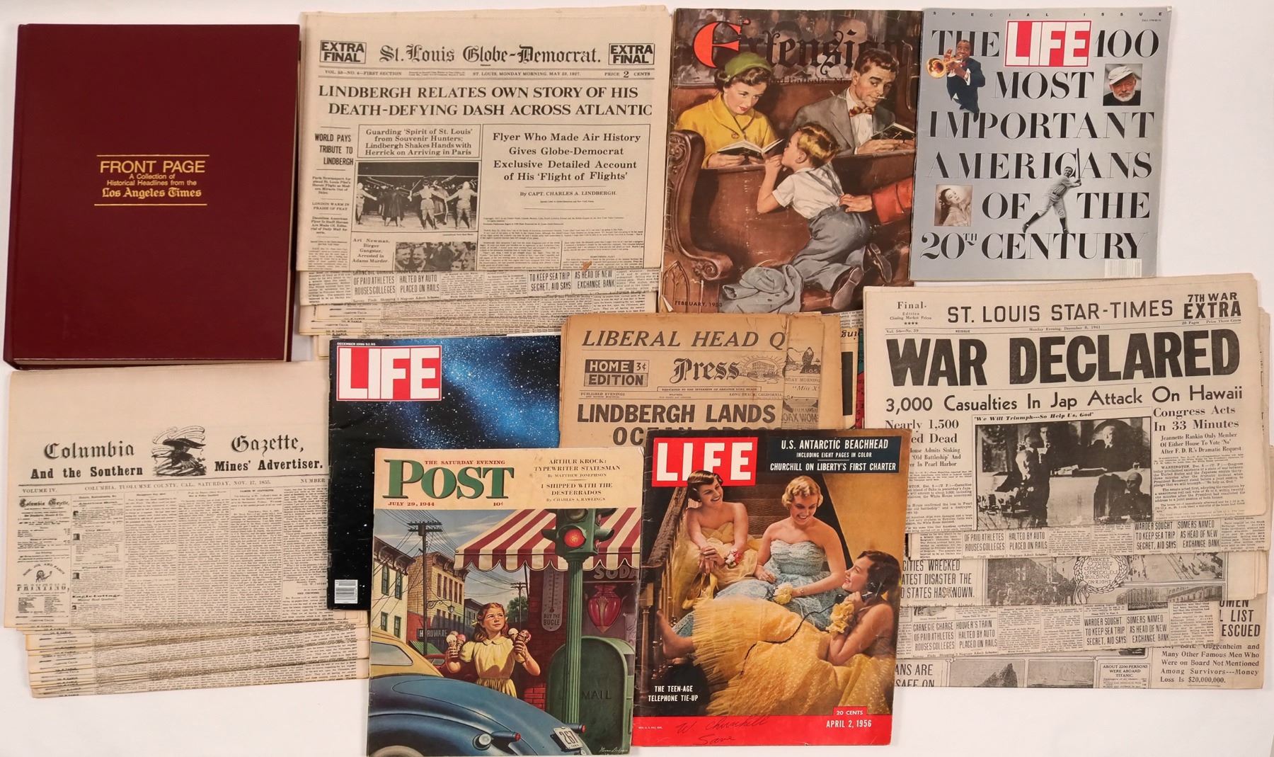 This is a a collection of newspapers highlighting the Charles Lindbergh flight across the Atlantic ocean in 1927; the decloration of war dated December 8, 1941; the San Francisco earthquake of 1906; the Stock Market crash of October 24, 1929; and the Titanic sinking in 1912. Some papers are reporductions and some are real. Also a book 11 in. X 14 in. with Los Angeles Times cover story headlines from 1881 to 1987. Events such as the San Fransisco earthquake, Kenndey Assisination, the Oswald assisinatinn, John Glen orbiting the earth, the landing on the moon by NASA; the Watergate scandal; the Charles Manson convictions; Nixon's resignation as President; and the shuttle Challenger explosion of January 28, 1986.