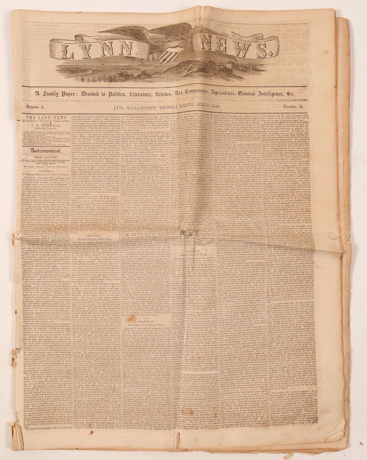 Very interesting collection of early newspapers. It includes the first science fiction article about "Orrin Lindsay's" , who traveled to the Moon and Mars. He was a fictional former student of John. L Riddell . Mr. Riddell was a very famous person at that time, and did a little of everything. You name it...he tried it !! A lot of other interesting reading in here as well. Turn the pages, and go back in time...yourself !! (RH). City: Lynn State: Massachusetts Date: 1848