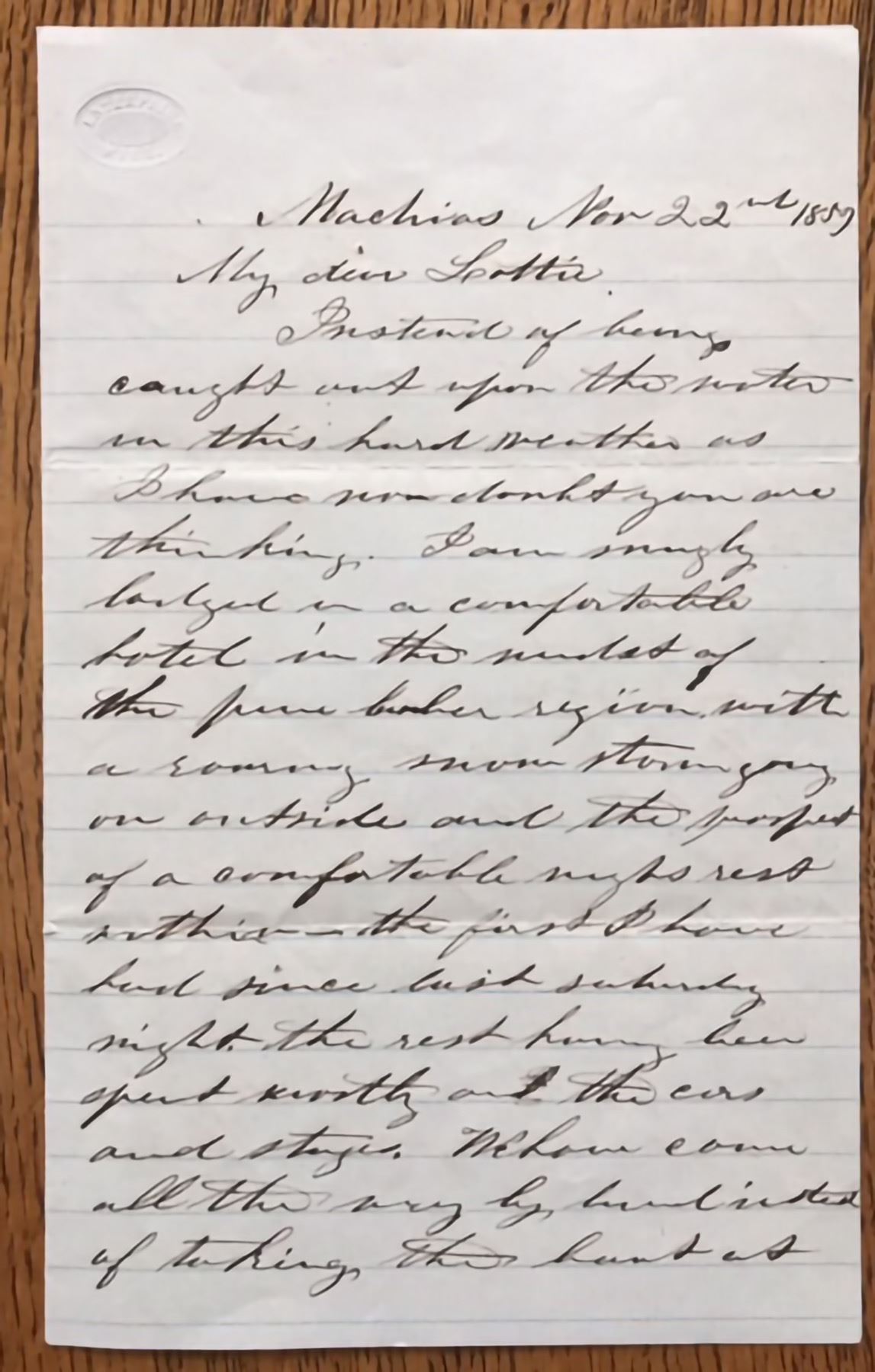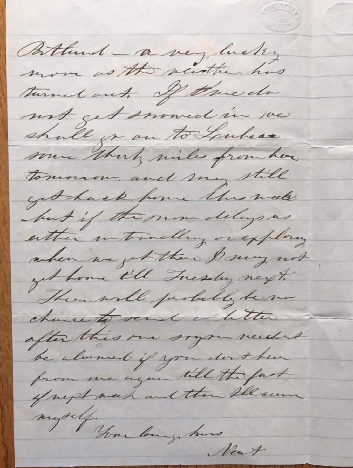 By November of that year, he was back in the United States, but once again traveling and exploring. The last letter (Nov 22, 1857) is written from Machias, Maine. ...where instead of being caught out upon the water in this hard weather as I have no doubt you are thinking, I am snugly lodged in a comfortable hotel in the midst of the pine lumber region with a roaring snow storm going on outside...the first comfortable night’s rest I have had since last Saturday night, the rest having been spent mostly on cars and stages. We have come all the way by land...If we do not get snowed in we shall go on to Lubec some thirty miles from here tomorrow and may still get back home this week. But if snow delays us either traveling or exploring when we get there, I may not get home until Thursday next.