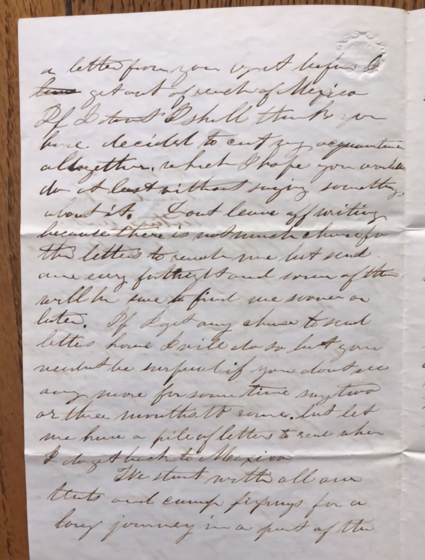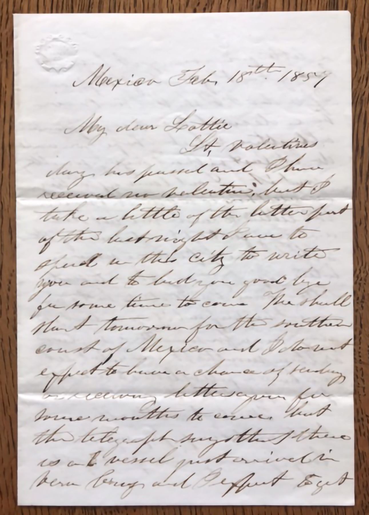 More that six months later, (February 18, 1857), he writes from Mexico City that he will be out of touch for awhile, as he is heading for the southern coast where he does no expect to be able to send or receive mail. We start with all our tents and camp fixings for a long journey in a part of the country where there are not many towns, and we expect to camp out most of the time...Had had a long look at your picture and bid it goodbye...