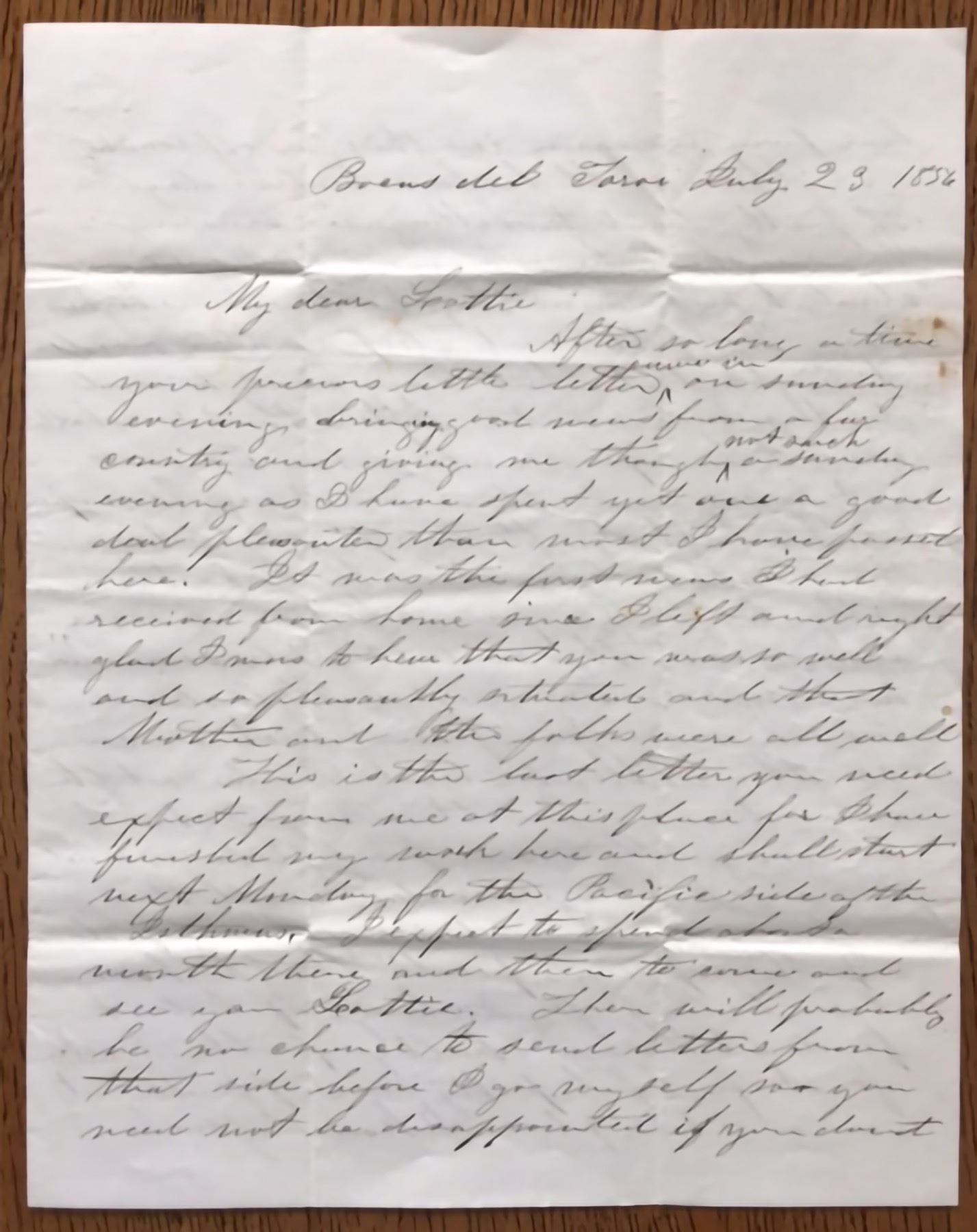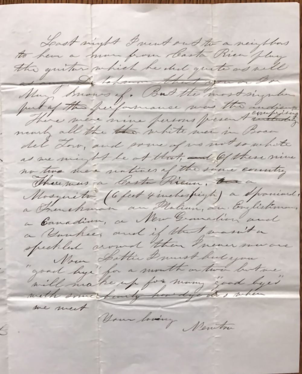All four letters are from Manross to his wife, Charlotte. The first, dated July 23, 1856 is written from Bocas del Toro, Panama. Two are from Mexico, and the last from Maine. All have interesting content describing his life as an exploration geologist. From Panama he writes (in part) This is the last letter you will expect from me at this place, for I have finished my work here and shall start from the Pacific side of the Isthmus next Monday...expect to spend about a month there...will be four or five days of hard travelling in crossing for we shall have to go on foot and climb mountains 8 or 10 times higher than Wolcott (CT) and sleep in the woods at night, but that I am used to and don’t mind much. After that, we shall come to an open country where we can get horses then won’t we scamper...Our road will lead us over a mountain from which we can see the Atlantic and Pacific at the same time. In the Pacific where I am going there are pearl fisheries and I mean to...see if I cant fish up that precious pearl...Last night I went out to hear a man from Costa Rica play the guitar...There were nine persons present comprising nearly all the white men in Bocas del Toro, and some of us not so white as we might be...There was a Costa Rican, a Mosquito (6 feet 4 inches high), a Spaniard, Frenchman, Italian, Englishman, Canadian, New Granadian and a Yankee and if that wasn’t a speckled crowd, then I never saw one.