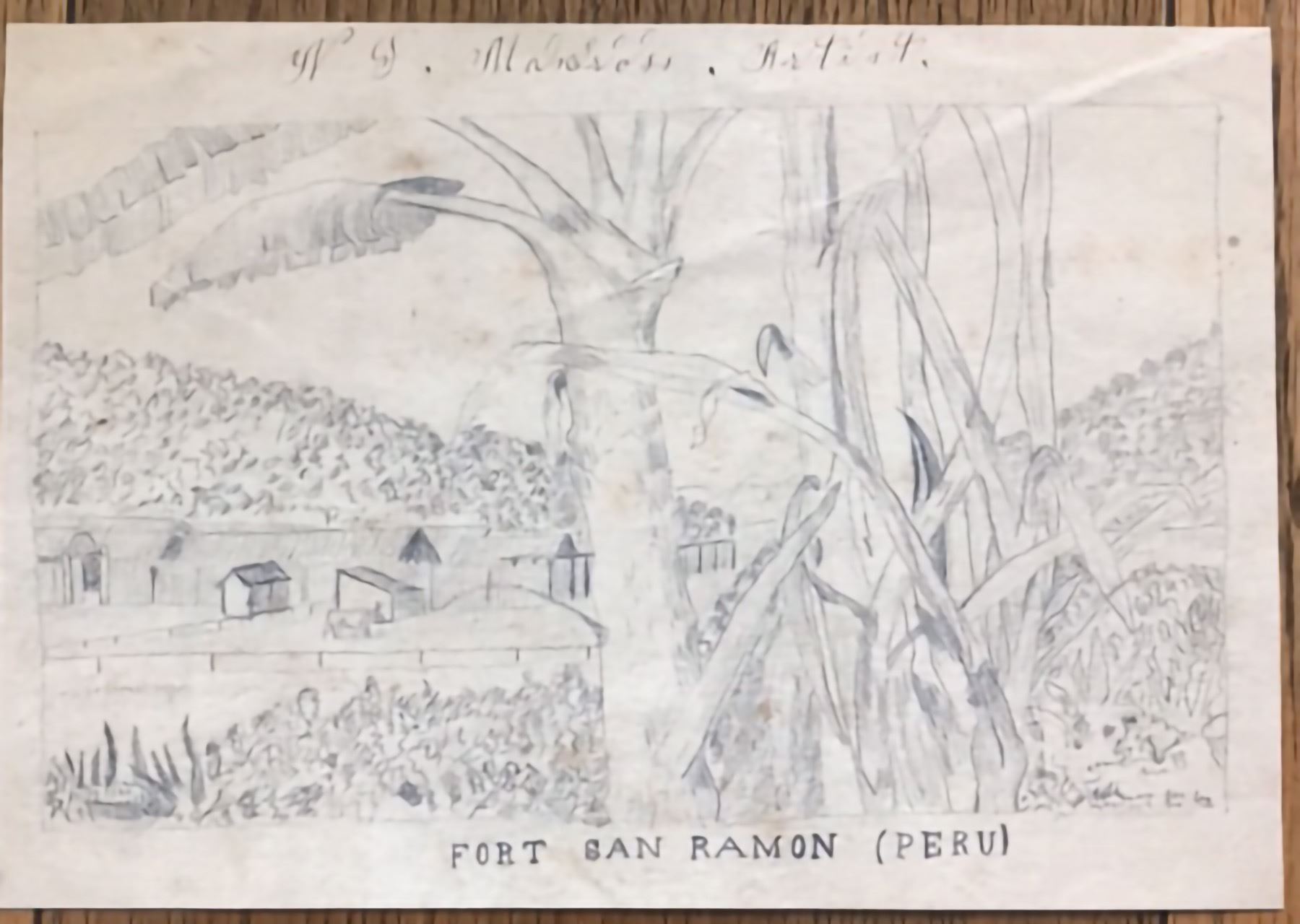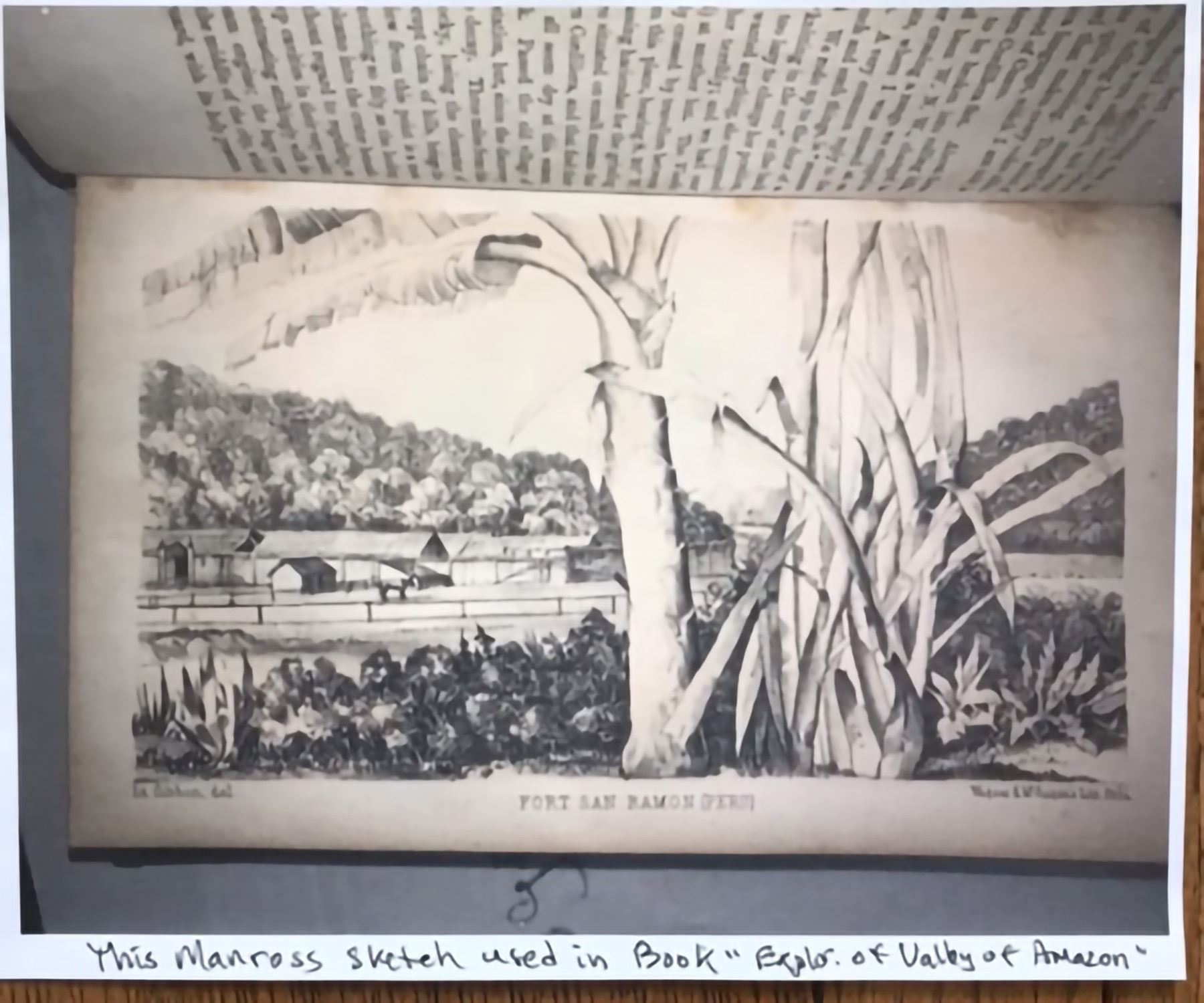 The sketch of Fort San Ramon in Peru, and at the top margin is written in ink “N.S. Manross, Artist”. It appears to be a preliminary drawing for the lithographed view of the fort that appears in William Herndon’s Exploration of the Valley of the Amazon, (Washington, 1854). It is certainly possible that Manross visited the fort during his time in South American in 1853, but we have found no evidence that he was part of Herndon’s expedition. Possibly he supplied the sketch for use in the publication.