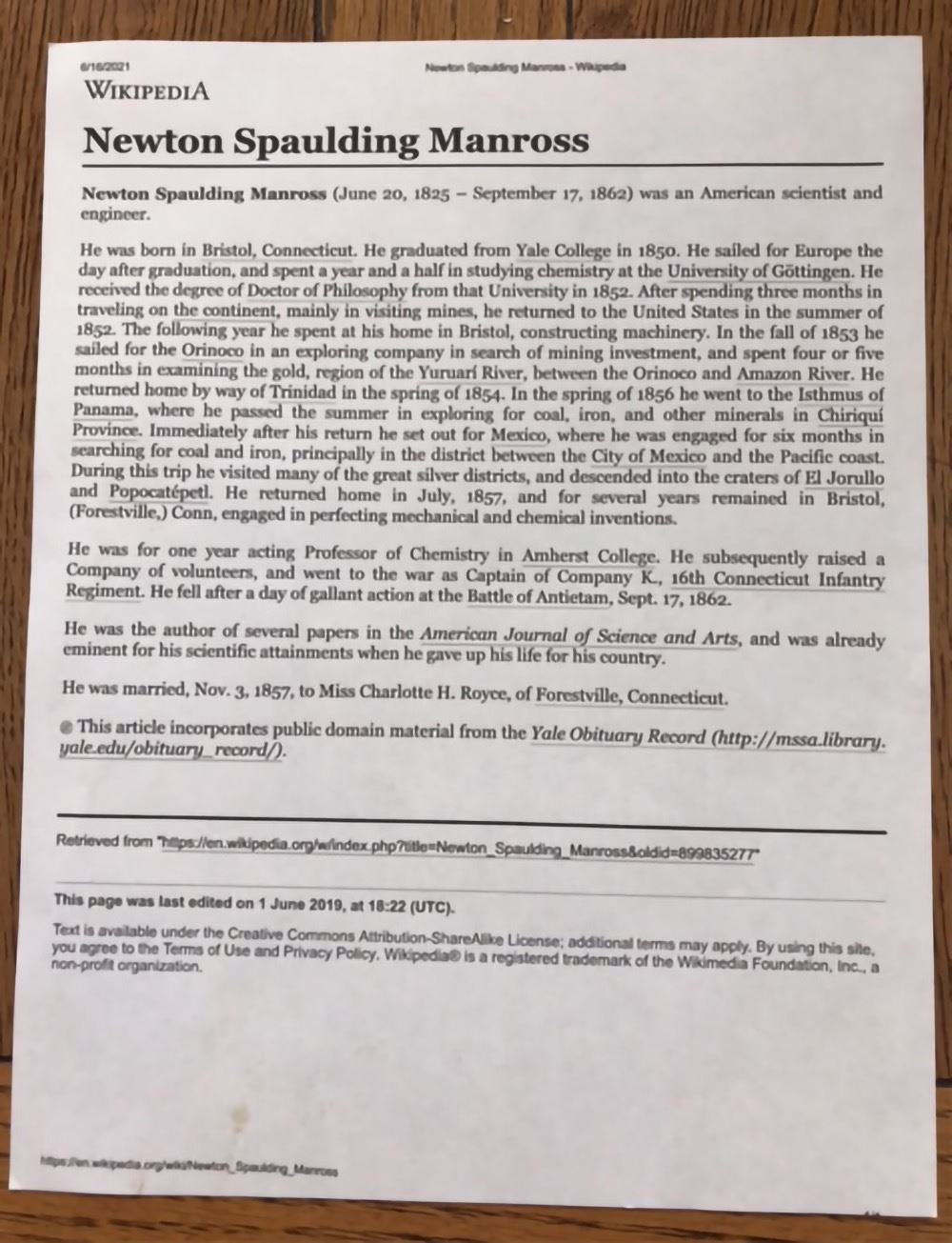 Four handwritten letters totally approximately 1,125 words, plus a 5.5”x8” pencil drawing, all in very good condition. Newton S. Manross, (1825-1862), was an accomplished American scientist and explorer who traveled extensively in Latin America before being killed in action in the Battle of Antietam at the age of 37. Born in Bristol, Connecticut, he graduated from Yale in 1850 and went on to receive a PhD in chemistry from the University of Gottingen. In 1853, he was part of exploring expedition searching for mineral deposits in South America and spent several months in the gold region of the Yuruari between Orinoco and Amazon rivers in Venezuela. In 1865, he went to Panama to explore for coal, iron-ore and other minerals. Later that year, he visited Mexico, where he traveled on horseback from Mexico City to the Pacific coast, prospecting for coal and iron, visiting the celebrated silver districts, and descending into the craters of Jorullo and Popocatepeti.