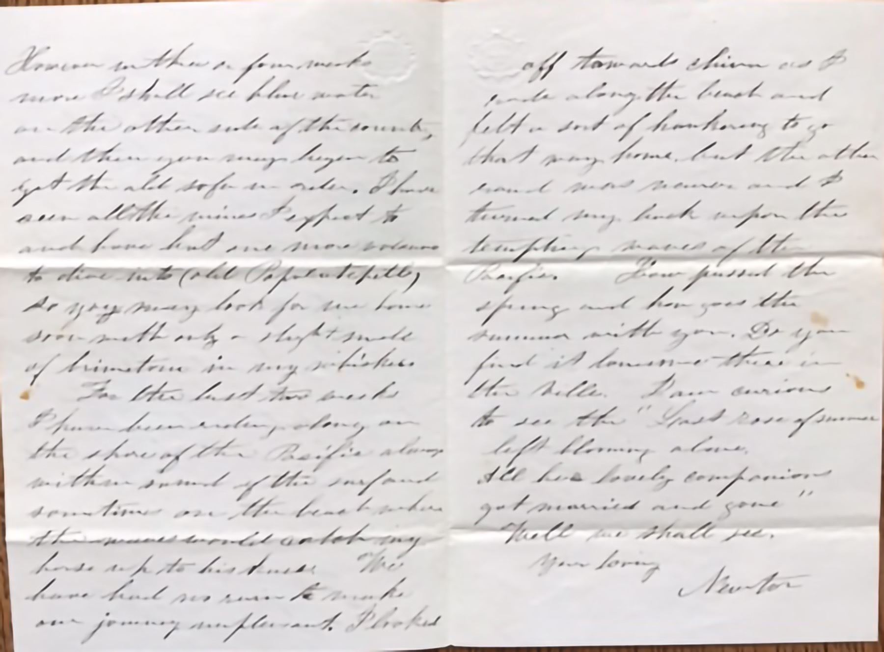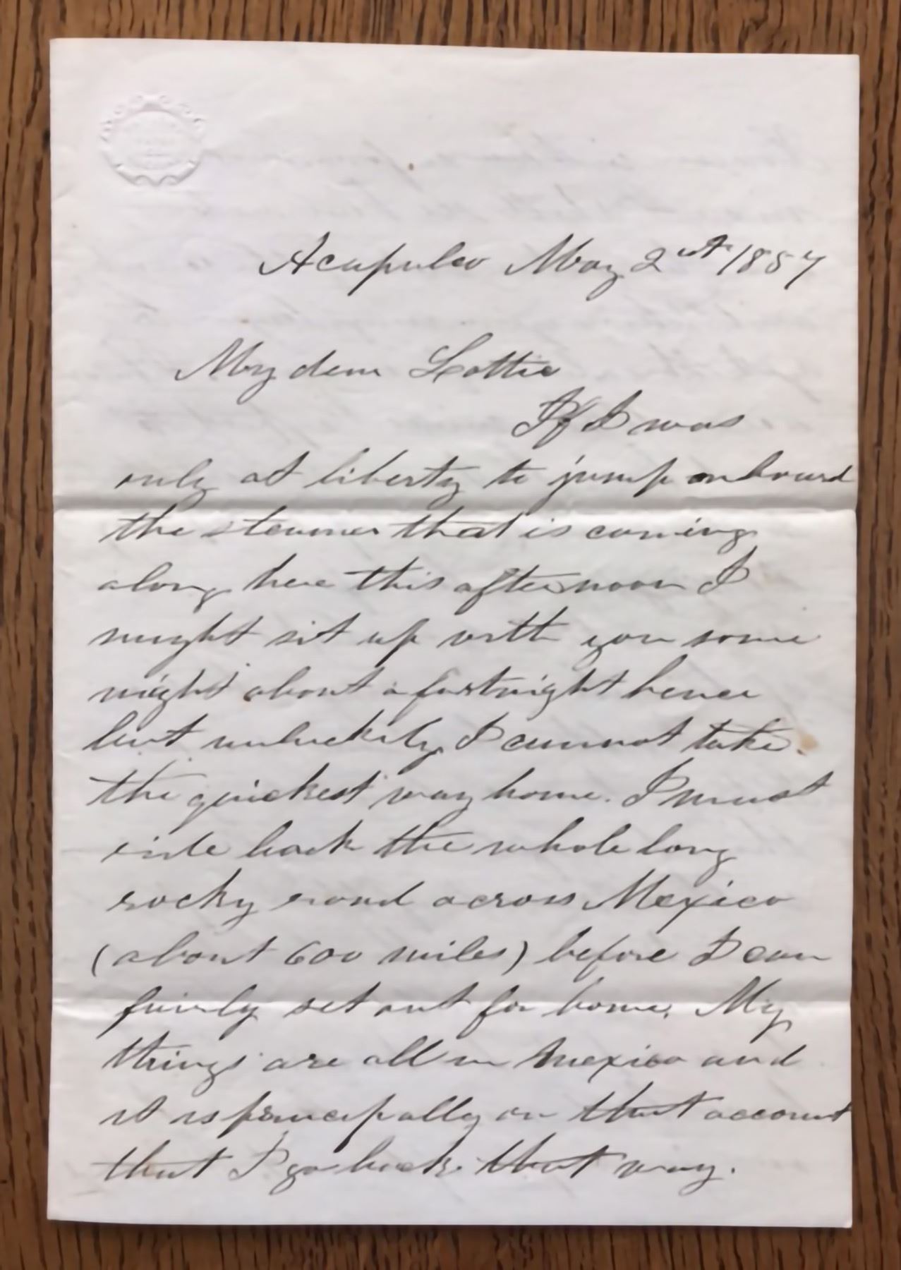 The next letter finds him in Acapulco, (May 2, 1857), where he reports If I was only at liberty to jump aboard the steamer that is coming along here this afternoon I might sit up with you some night about a fortnight hence, but unluckily I cannot take the quickest way home. I must ride back the whole long rocky road across Mexico, (about 600 miles), before I can fairly set out for home...I have seen all the mines I expect to and have but one more volcano to dive into (Old Popocatepely), so you may look for me home with only slight bit of brimstone in my whiskers. For the last two weeks I have been riding on the shore of the Pacific always with sound of the surf and sometimes on the beach where the waves would catch my horse up to his knees. I looked off to China as I rode along the beach and felt a sort of hankering to go that way home...
