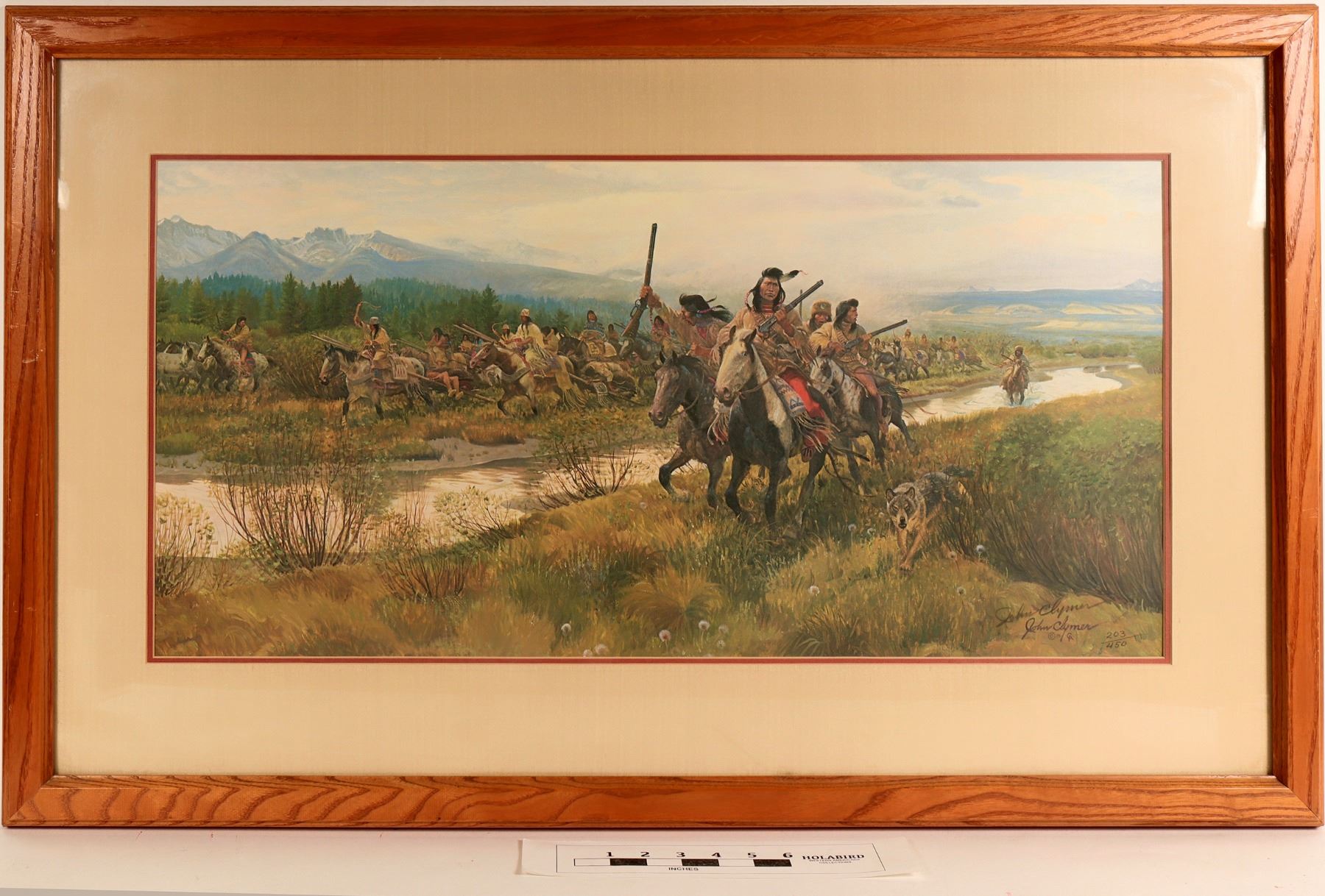 Signed, numbered print 203/450 by western artist John Clymer. Clymer is listed in Who was Who in American Art 15-64-1975. Measures 39" x 24" matted and framed.