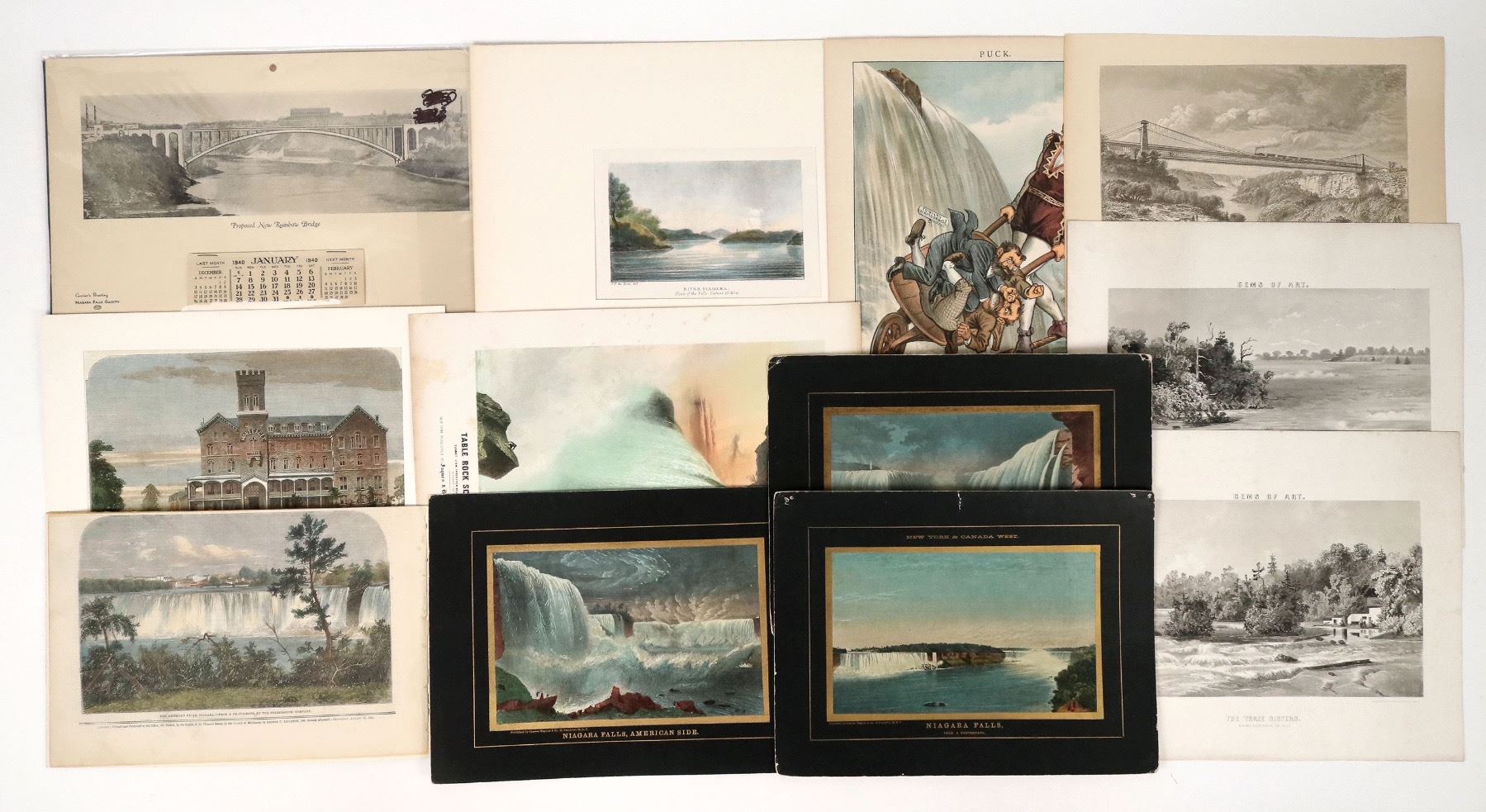 A collection of 12 antique lithographs of different views of Niagara Falls and its surroundings, c1860-1916. Includes a Puck magazine political cartoon by Bernhard Gillam, c1885, titled, "The Shaky Situation of the Political Blondin," which depicts Theodore Roosevelt, and two other men, possibly financier Jay Gould and Judge Theodore Westbrook, and may relate to when Roosevelt was a member of the NY State Assembly when he exposed the potential corruption in Albany and assumed a high and positive political profile in multiple New York publications. Magazine page on verso. Other lithos include: "Table Rock Schottisch," pub. Jaques & Brother, NY; "River Niagara, Cloud of the Falls Distant 15 Miles," F.F. de. Roos.; "Monteagle House Hotel, Niagara Falls"; "The American Falls, Niagara.-From a Photograph by the Stereoscopic Company," pub. George C. Leighton, London, 1860; etc. Please see photo(s) for more details.