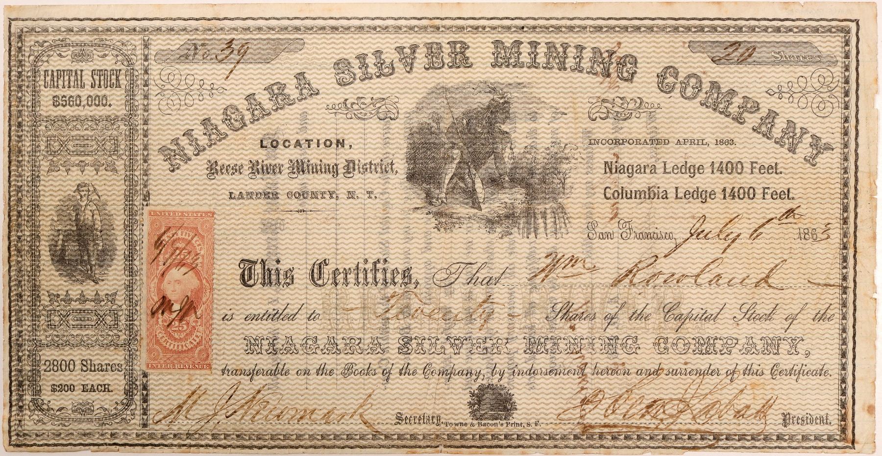# 39 for 20 shares to William Rowland. Signed by MJ Newmark and president Jabatt (difficult to read as written on safety paper). Dateline July 6, 1863. Incorporated April 1863. Location: Niagara Ledge, 1400 feet and Columbia Ledge, 1400 feet. Small miner vignette and larger Native American vignette. 25c Certificate revenue stamp. Not cancelled. Expected wear on certificate this old. Newmark has already been seen as secretary on the Washington and Commerce Reese River certs in previous auctions. Ken Prag Collection