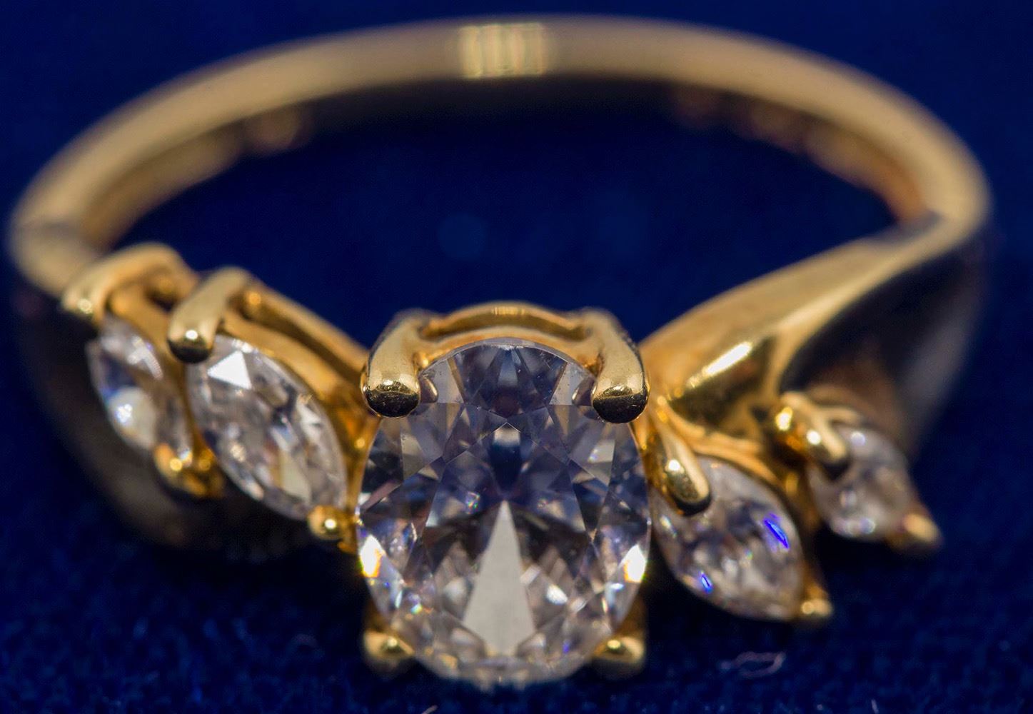 14K gold, 5 CZ's, large center stone, .10 ozs. Size 7.5. Date: Location: HWAC# 44359