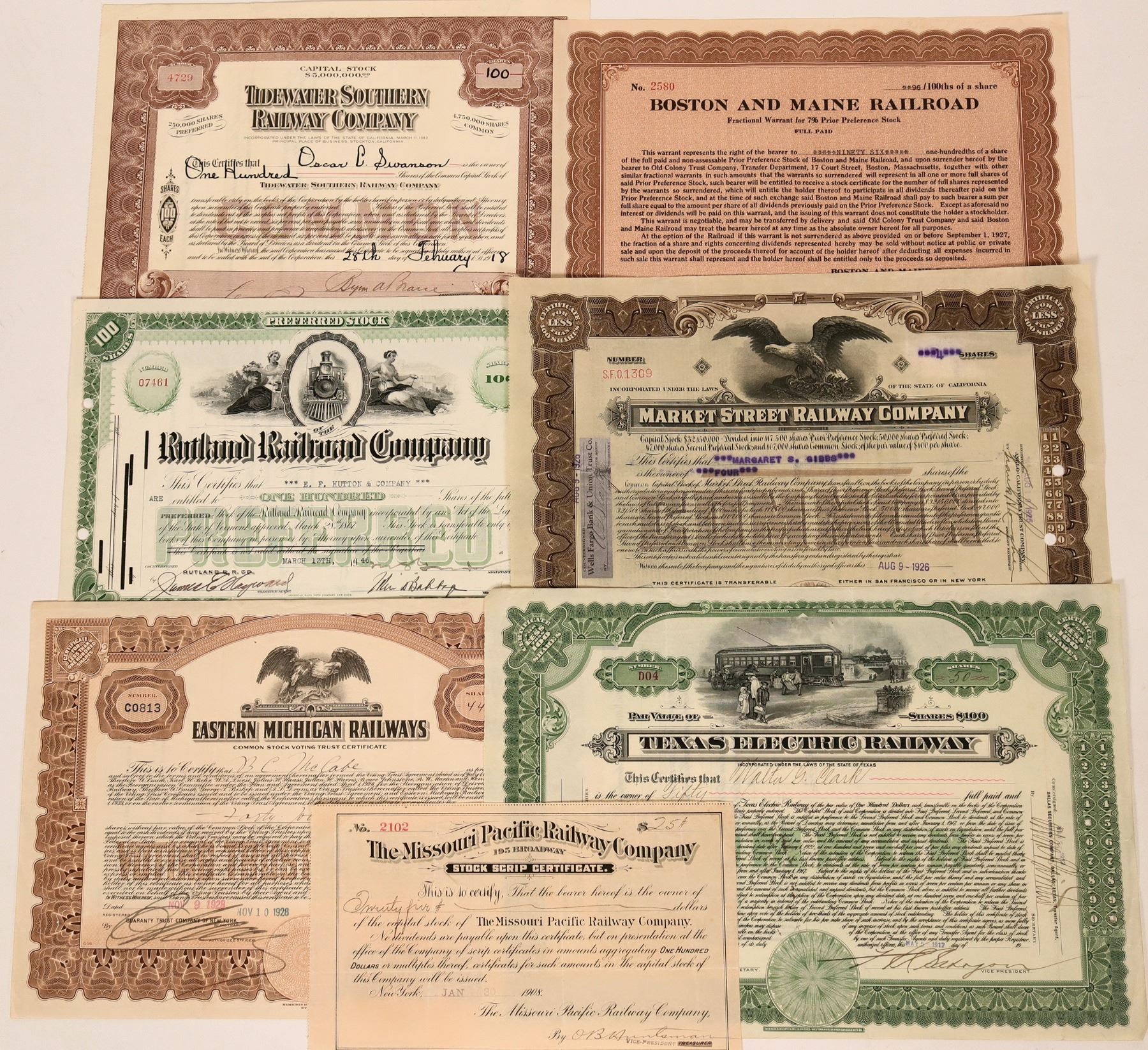 Lot includes: Texas Electric Railway, 1917; Eastern Michigan Railways, 1928; Market Street Railway (CA), 1926; Rutland Railroad Co, 1946; Boston & Maine Railroad, 1926; Tidewater Southern Railway Company, 1918; and Missouri Pacific Railway Company, stock scrip, 1908.