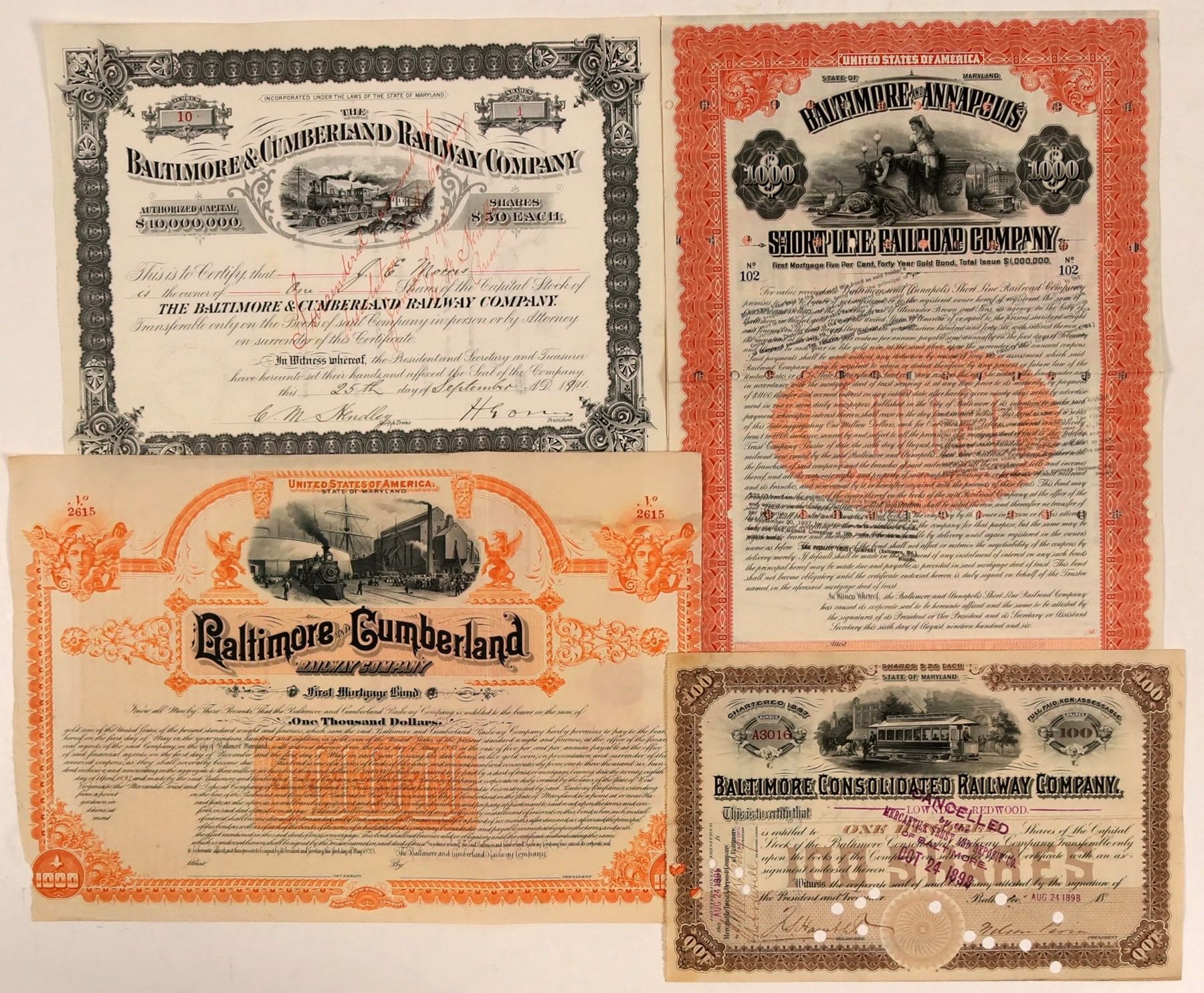 Lot includes: Baltimore Consolidated Railway Company, 1898, streetcar, hole and stamp cxls.; Baltimore & Annapolis Short Line Railway Company Bond, 1906. 1st Mortgage, 5%, Forty year Gold Bond. Coupons. Hole cxls.; Baltimore & Cumberland Railway Company, 1911, Cert. #10, steam engine. Red pen cxled.; Baltimore and Cumberland Railway Company, $1000, 1st Mortgage Bond, U/I. Fantastic vignette.