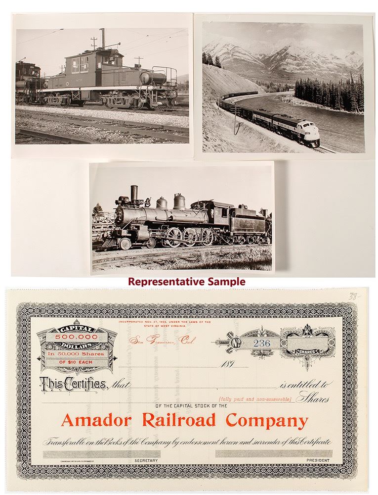 60 photos includes: 4 Sierra Railroad photos; 12 Hawaiian, and 8 California Western. Also included: Denver & Rio Grande, San Diego and Arizona Eastern, Santa Fe, Apache, Sierra Railroad, G. F. Co. Wahiawa, Oahu Railway, etc. ; San Diego Street Car; Daylight car views; and more. Unissued stock certificate from the Amador Railroad Company. 10 x 5 1/2 inches. Circa 1890s. HWAC# 571615 Date: Location: