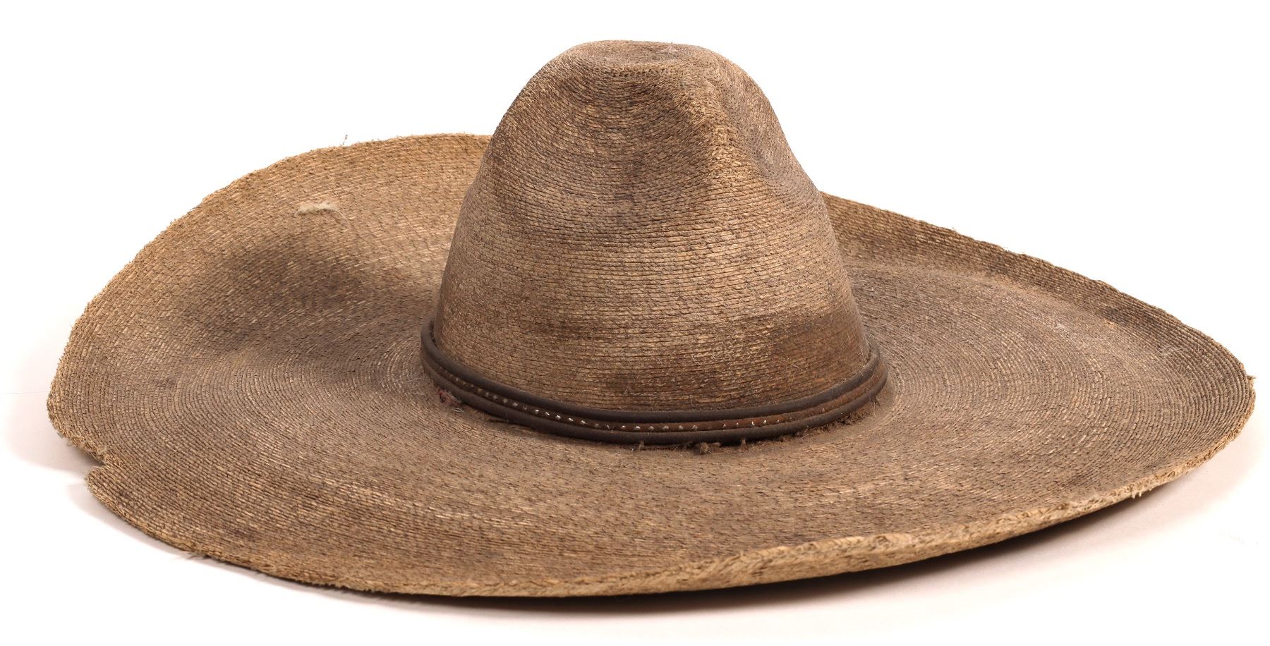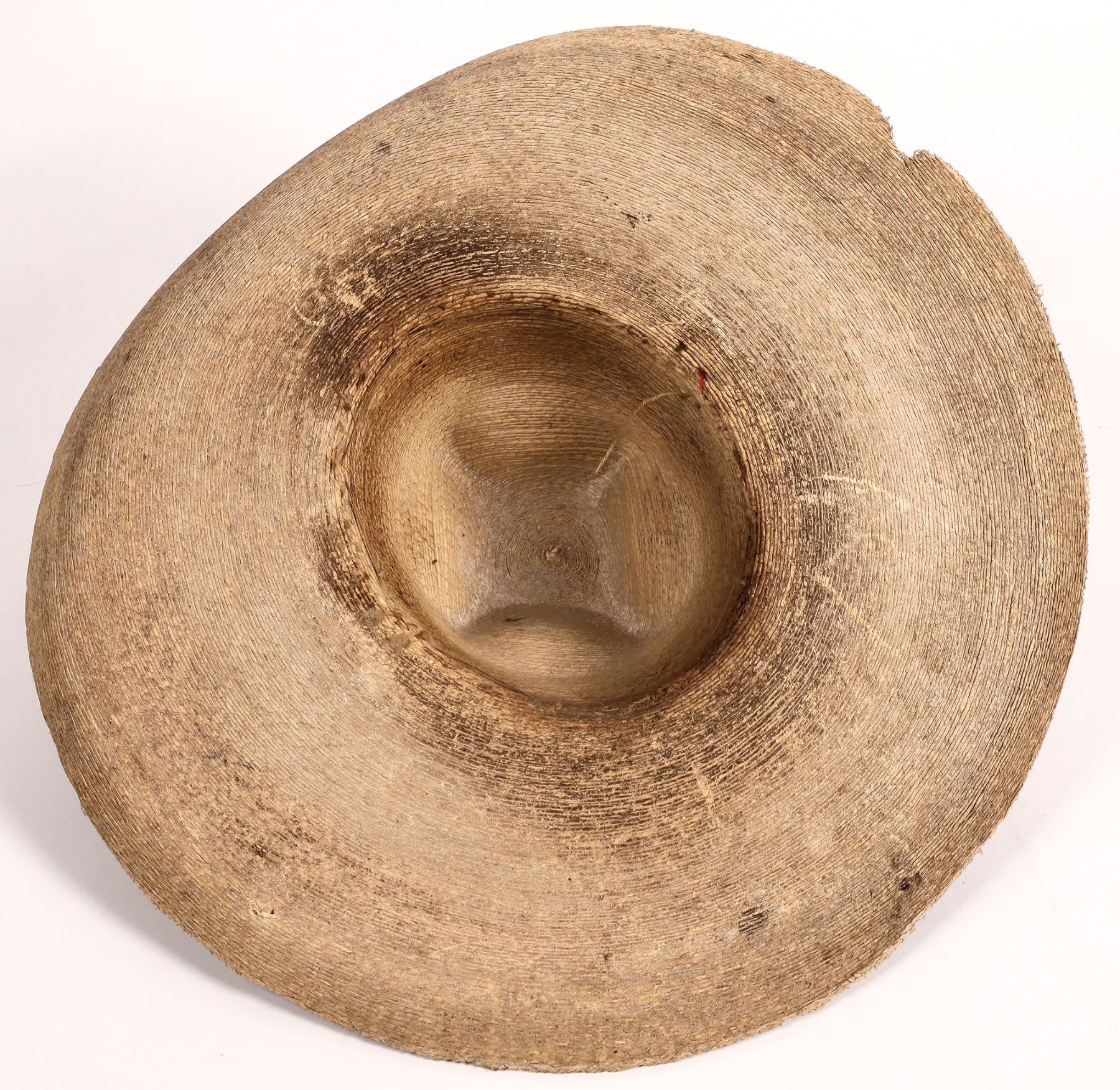 Nice c. 1920's to 40's Mexican sombrero. Made in a coiled basketry design and well constructed. Sewn with thread, possibly hand formed from cotton. Leather band with a plastic decorative wheel. Probably a daily wear sombrero as there is some edge wear and a 1.5" edge chip. About 18" diameter.