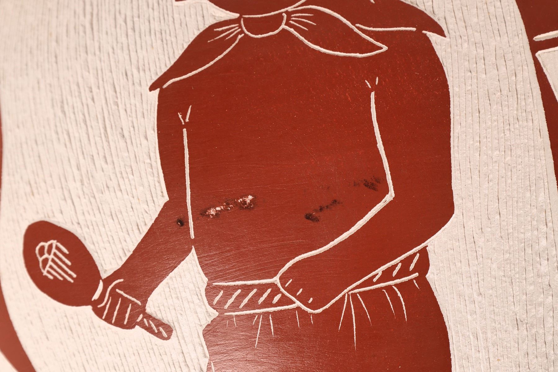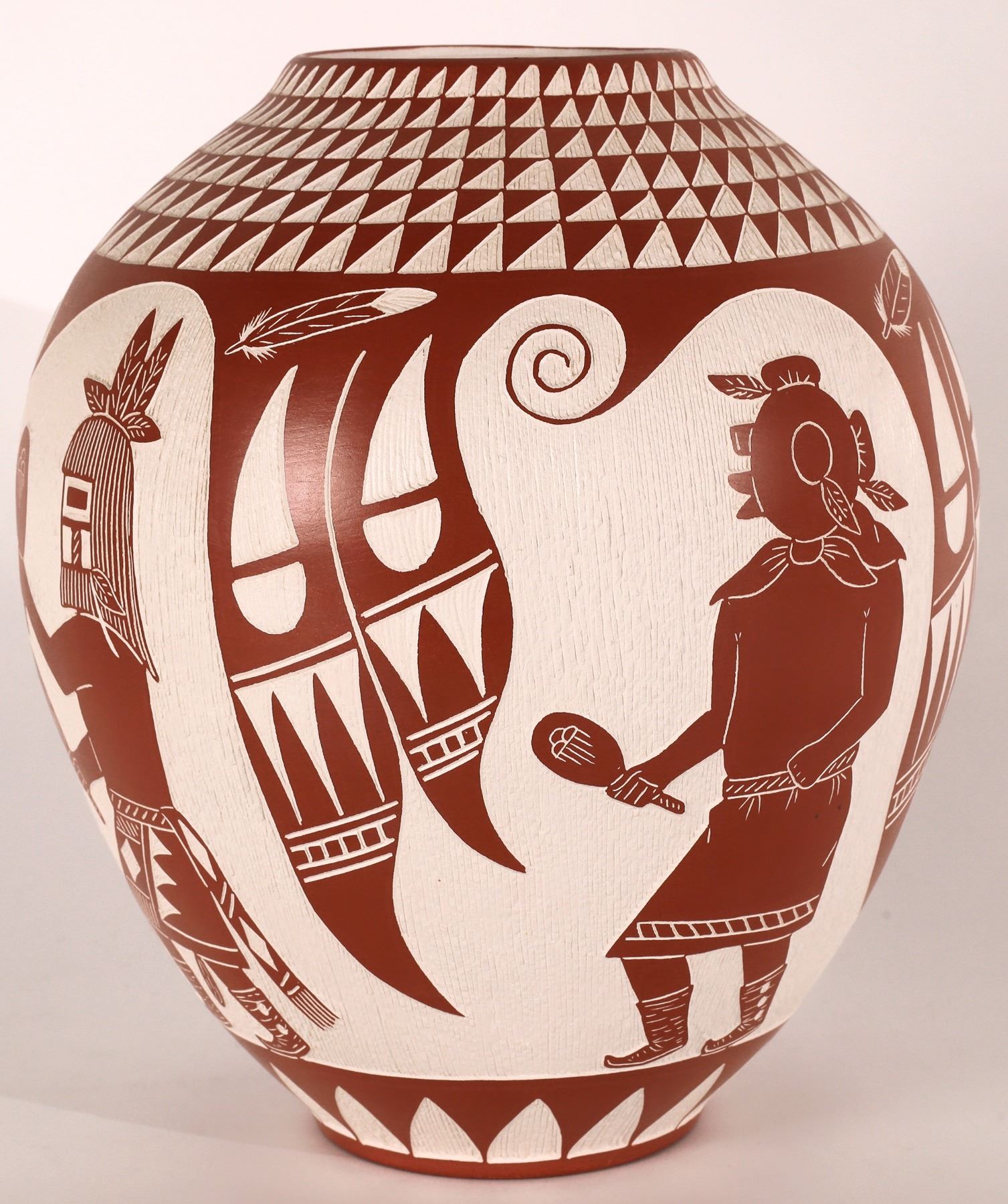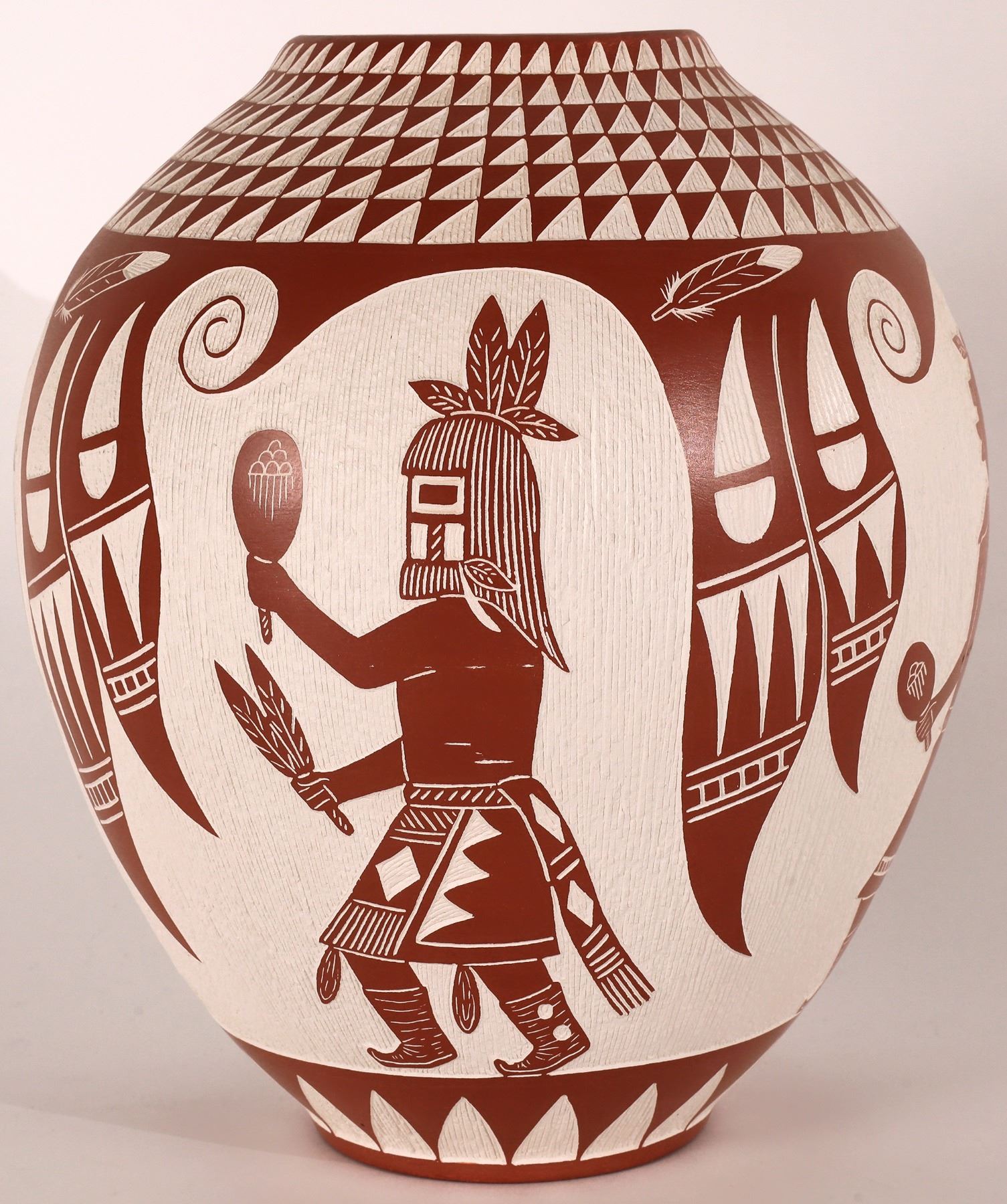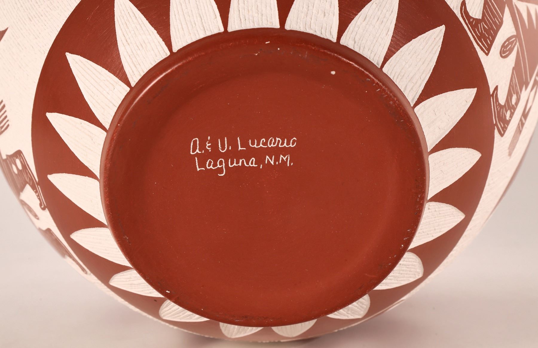 Nice brown and white hand etched ceramic? pot signed by A & V Lucario, Laguna, NM. Arthur Lucario was born in 1942 and is half Acoma and half Laguna. He first draws the designs on the pots then does the etchings. 4 Native American men in design. 11x9".
