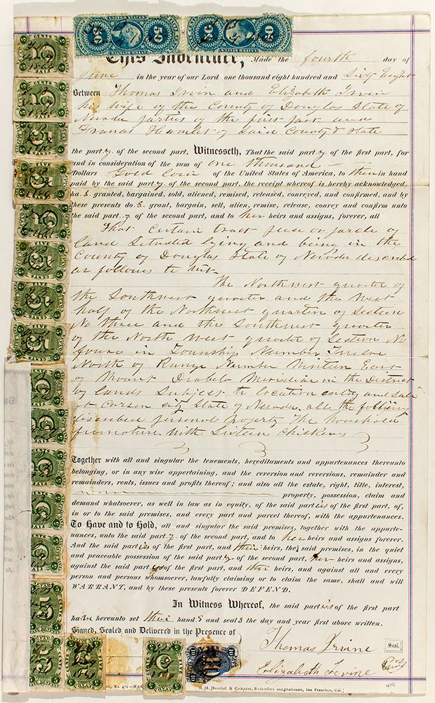 From the James Reynolds Collection, a major Nevada collector in the 1960s-70s. Nevada stamps: seventeen green 5 cent (D5) and one blue 10 cent (D24) stamps. Also two blue 50 cent US IR stamps. Deed dated June 4th, 1868. Land transaction (for "household furniture with sixteen chickens") for $1,000 in gold coin between Thomas & Elizabeth Irvine and Frances Humber. Township Number Twelve North, Range Nineteen East, which places this in Mottsville. For 14" x 9"