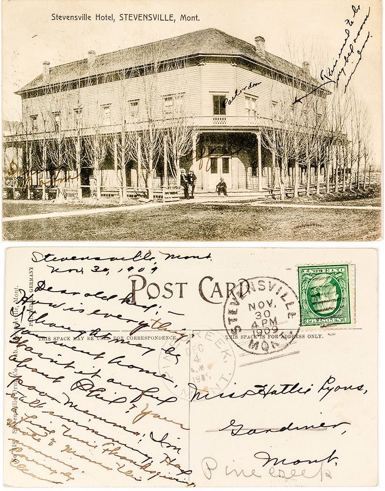 Nice black and white photo of the Stevensville Hotel. Hand written notes on fronts include "parlor door" and "This used to be my bedroom window." The Pine Creek cancel (1904-1914) is a forwarding cancel. Sent from Stevensville. HWAC# 40274 Date: 1909 Location: Stevensville, Montana