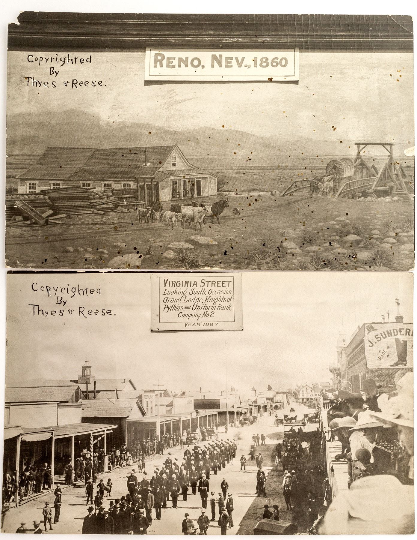 1) Copyrighted by Thyes & Reese. Shows Grand Lodge, Knights of Pythias Number 2 marching in uniform down Virginia Street. 2) Copyrighted by Thyes & Reese. Shows Reno in 1860. State: Nevada City: Reno HWAC#: 46796 Date: 1887