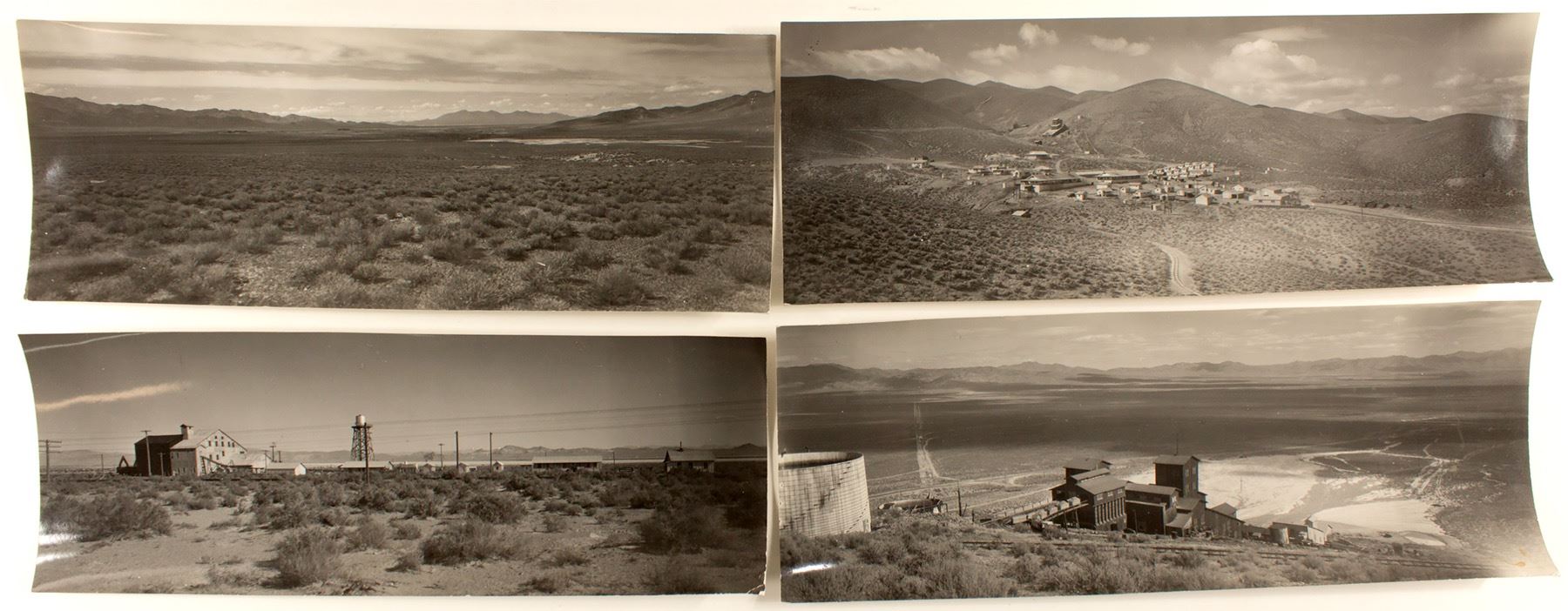 Four unpublished panoramas. 17 x 6 1/2". Framed, viewable on both sides of frame. 1) Toulon Mill on the Southern Pacific railroad line. 2) The town, offices, mine, and mill buildings at Tungsten. 3) Close up of the mill on the hill and the railroad tracks. 4) View of the Nevada desert below Tungsten. Town has been identified by a site visit. The mill and mine are closed down, but still ready to restart as there is a 24 hour guard there. Stone foundations of the office buildings are still present. The Tungsten deposits in these hills were discovered in 1917. In the early 1930’s this area produced most of the nation’s tungsten. As many as 280 men were employed here during World War II. For nearly three decades this area consistently produced and ore was regularly shipped. It remained one of the most important tungsten mines in the United States. Framed! State: Tungsten, Pershing City: Nevada Date: HWAC# 99637