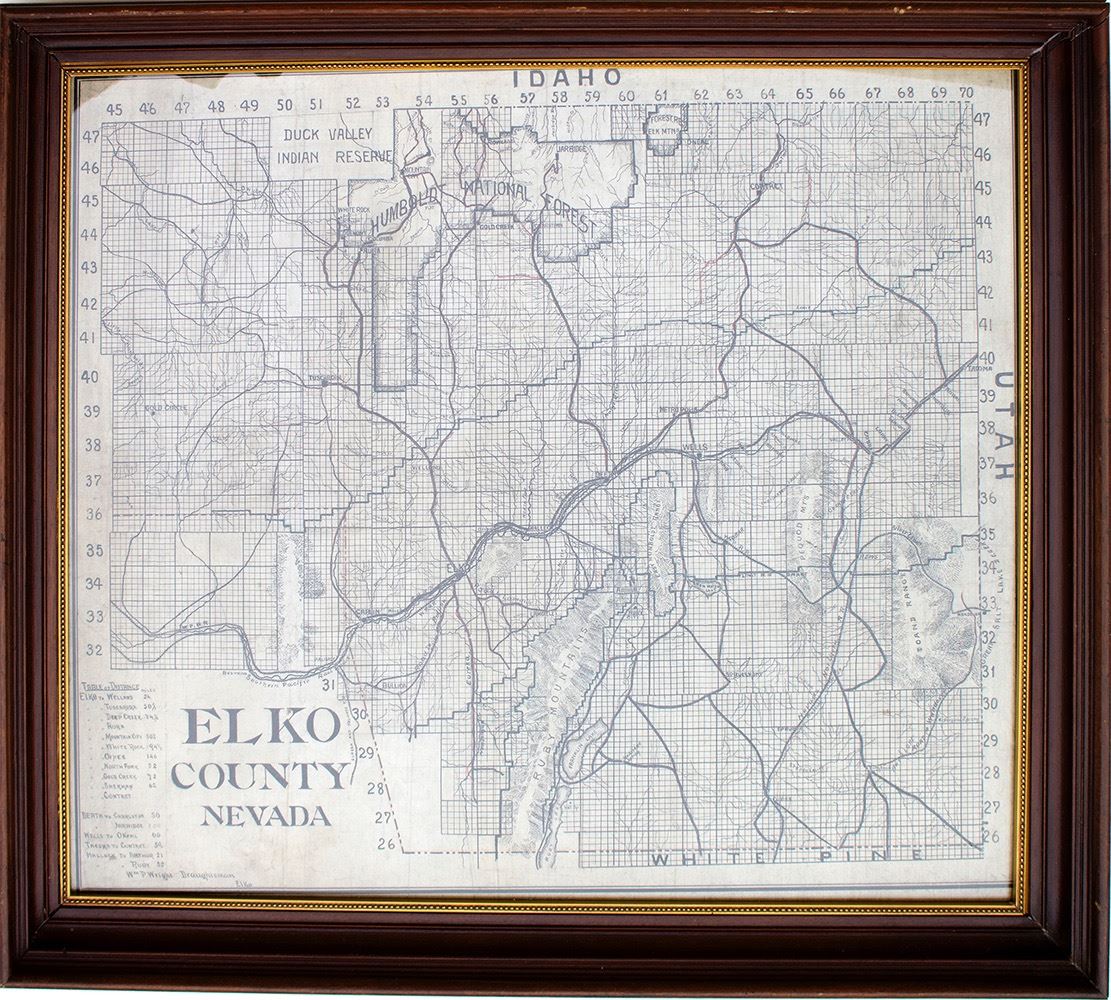 8 x 24" map (28 x 32" framed) of Elko County. Drawn by draughtsman William P Wright. Wright appears in Federal records as early as 1872 as a draughtsman. This map shows the Western Pacific railroad (making it c1908 or later), Southern Pacific and Northern Nevada. Stops along the Southern Pacific are named. Also named are some creeks, lakes, hot springs, valleys, etc. Towns listed include Charstown, Roland, Aura, Bullion, Bews, Welland, Gold Creek, etc. All-in-all excellent condition. HWAC# 48439 Date: Location: Elko County, Nevada