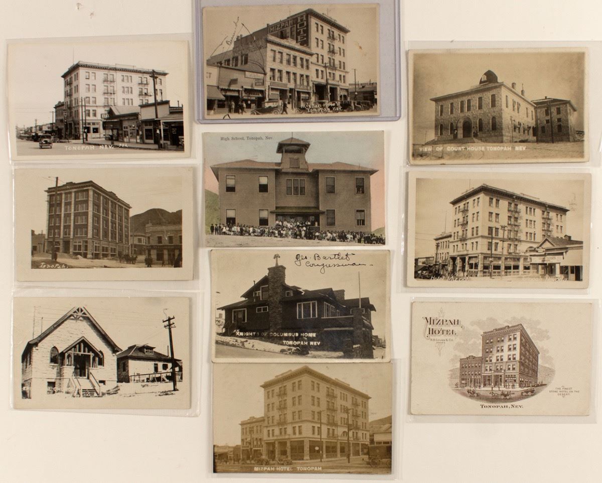 Mostly RPC's. One in color. Includes the Mizpah Hotel, Knights of Columbus house, Nye & Ormsby Bank, Episcopal Church, and high school. Five are cancelled from Tonopah and one from the Reno & Goldfield RPO. All c1913. "Mackay made auditor at Philadelphia PA." "...sold TB(?) fro 12 1/2 per. (Prag collection) City: Tonopah State: Nevada Date: hwac# 23387