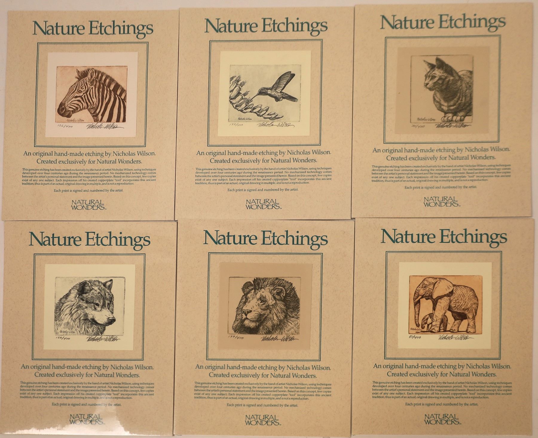 Six Nature original etchings by Nicholas Wilson (1947-), signed and numbered by the artist. Published by Natural Wonders. 1) Zebra, 126/400. 2) Hummingbird, 177/400. 3) Domestic Cat, 201/400. 4) Wolf, 126/400. 5) Lion, 177/400. 6) Elephants, 51/400.