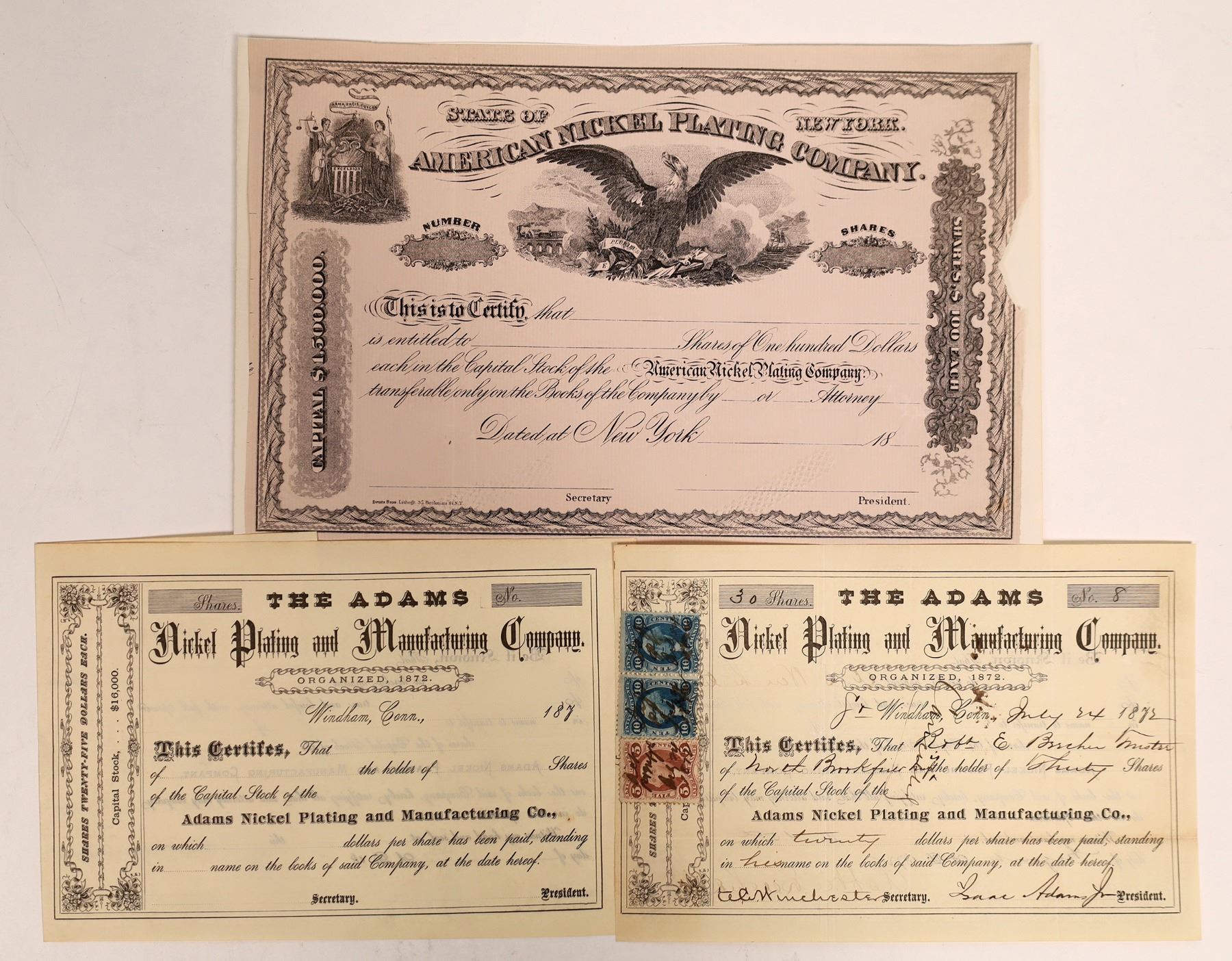Lot of three certificates: two from The Adams Nickel Plating and Manufacturing Company, one issued 1872 with revenue stamps, one unissued; also the American Nickel Plating Company, unissued.