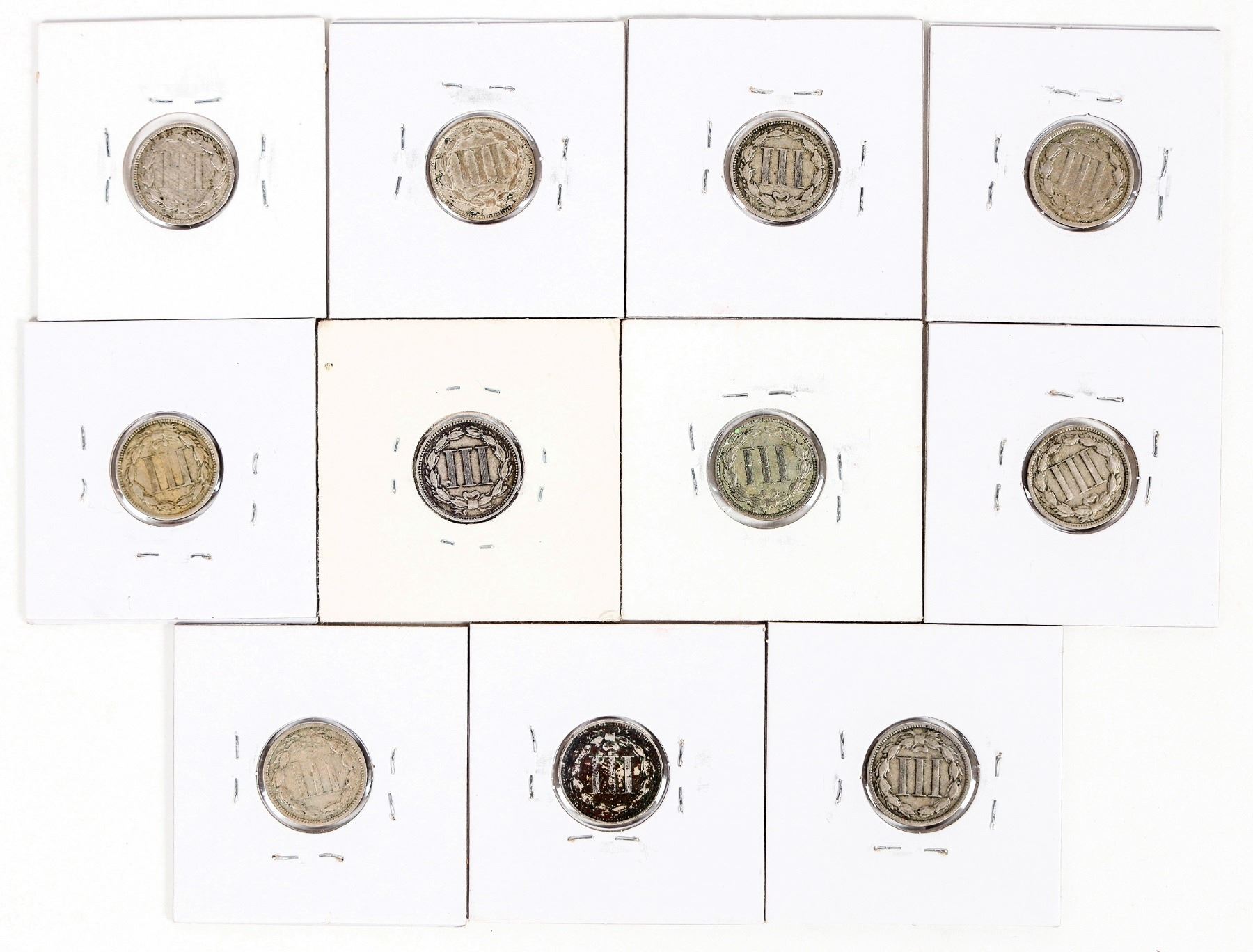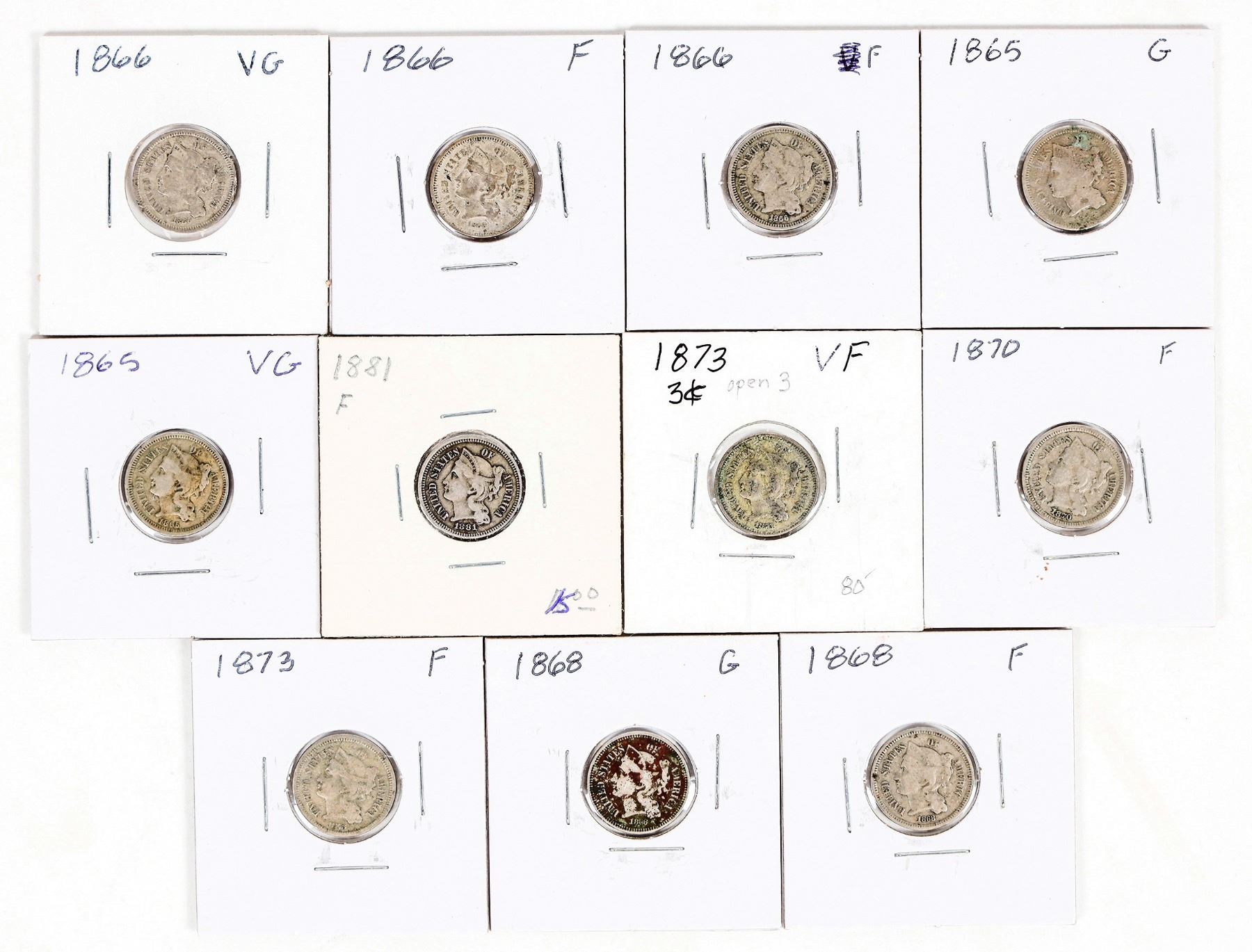 "Nickel three cent pieces were issued because their silver counterpart was hoarded by the public," The Red Book. Eleven coins: 1865 (2: G, VG); 1866 (3: VG, F(2)); 1868 (2: G, F); 1870 (F); 1873 (2: F, VF); 1881 (F).