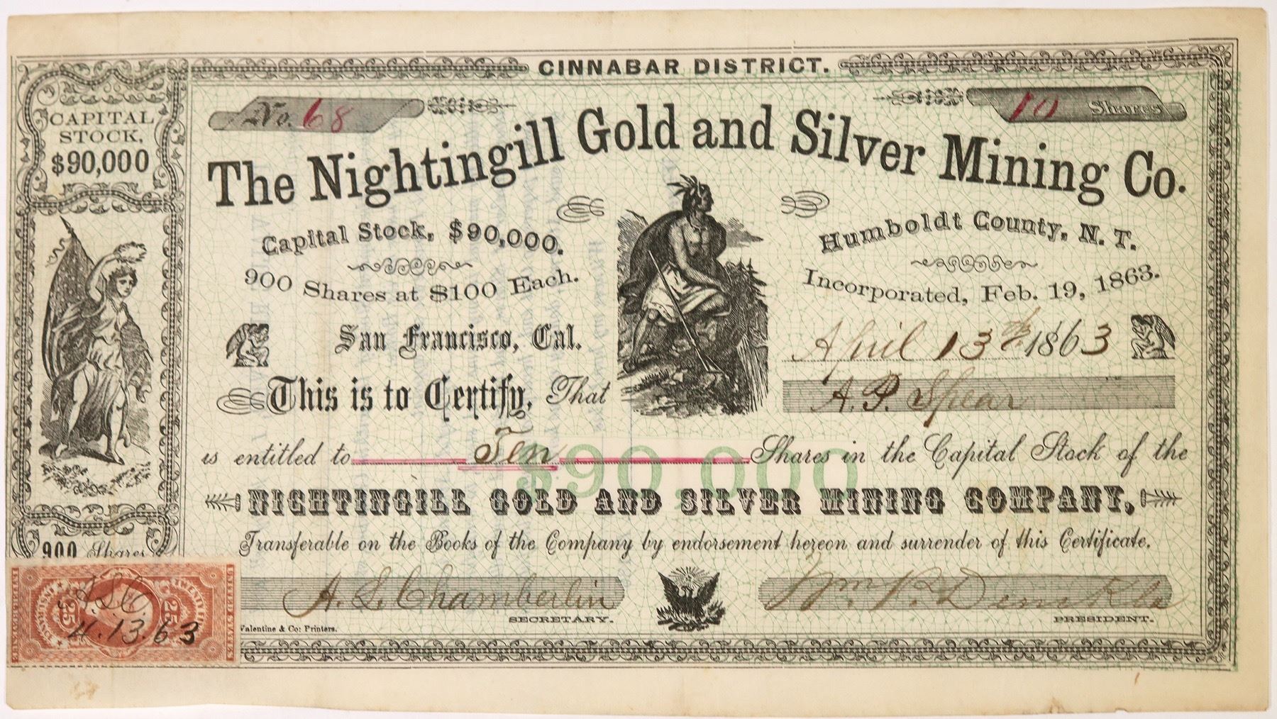 # 68 for 10 shares to AP Spear. Signed by AS Chamberlain (Commissioner of Deeds) and president William Denckle (arrived in Humboldt County in 1862 and a serious promoter of mines there). Dateline San Francisco, April 13, 1863. Incorporated February 19, 1863. Not cancelled. 25c Insurance stamp. Valentine & Co. printer. Green safety paper with underprint green '$90,000.'Native American and allegorical vignettes. Located on what is known as the Peacemaker Quartz Lode in the Cinnabar Mining District in Humboldt County, Nevada Territory. Nightingill probably named for A. W. Nightingill who once camped with Chief Winnemucca before the First Battle of Pyramid Lake in 1860. Biographies of Nightingill and Denkla and their interest in Nevada mining. Paragraph on the Cinnabar Mining District. City:Cinnabar, Humboldt Co. State:Nevada Date:1863