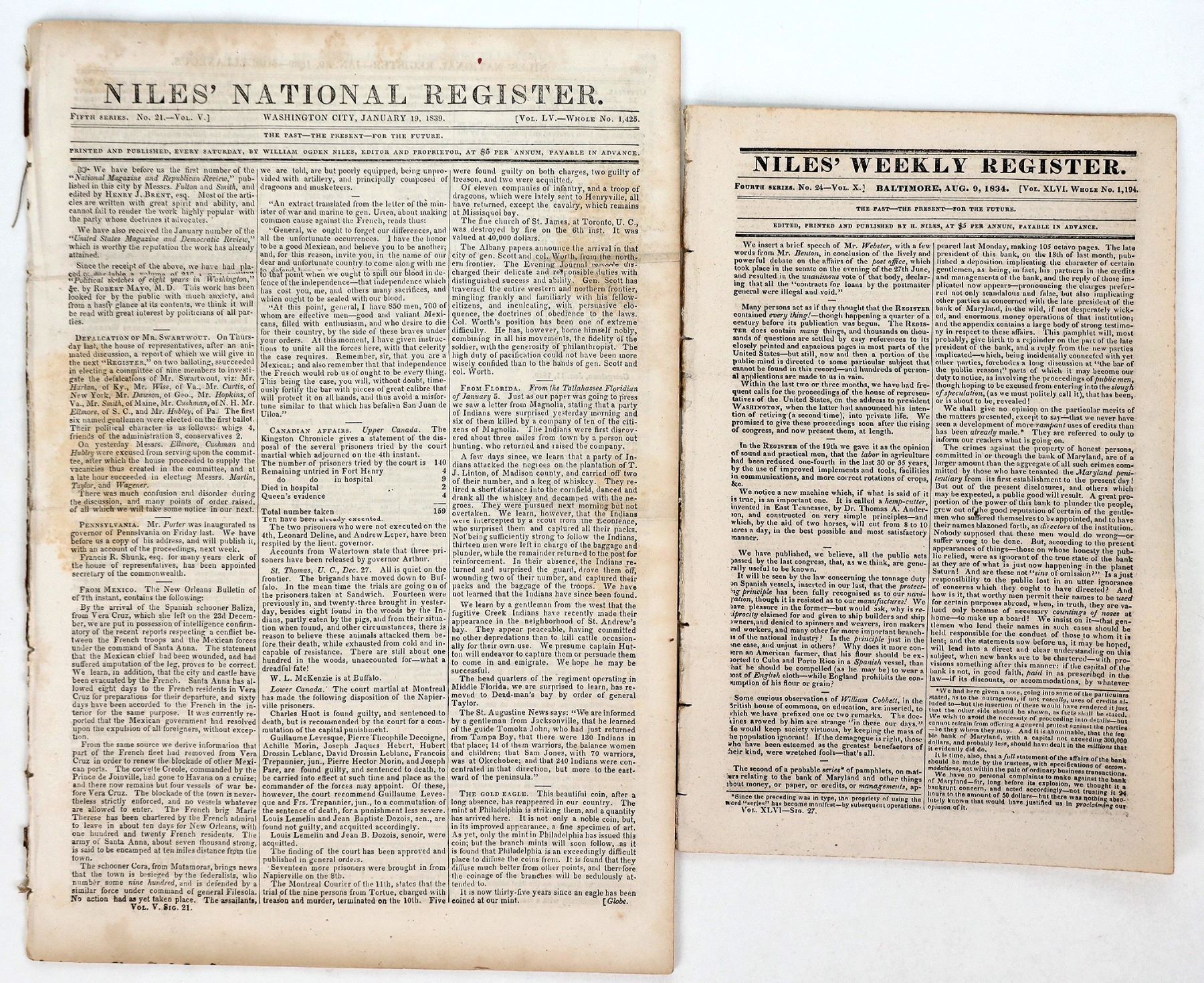 Lot of 2. Two Niles' National Registers publication's. In protective sleeves and very good condition, dated Aug. 1834 and Jan 1839. Gold coin news .