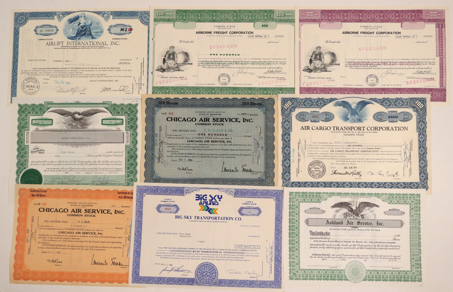 Lot of 9. Included: Chicago Air Service, Inc. ( two different varieties, both 1929); Capital Flying Services, Inc. (1971); Big Sky Transportation Co. (1980); Ashland Air Service, Inc. (unissued); Airlift International Inc. (1968); Airborne Freight Corp. (two different specimen); and Air Cargo Transportation Corporation (1946). Nice condition. Ken Prag Collection