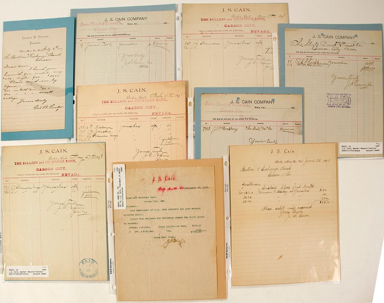 One small George W Penter, Banker letterhead. Please send me by express $600 in gold coin, 20's and $400 in smaller gold coin. Six J. S. Cain banking ledgers. Stamped from the State Bank & Trust or Bullion & Exchange Bank. Two J. S. Cain letterheads. One is a draft for Kirman & Rickey and the other is for checks for Cain and J. W. Wilson. ({Potter Collection) Date: 1887-1903 Location: Bodie, California HWAC# 59407