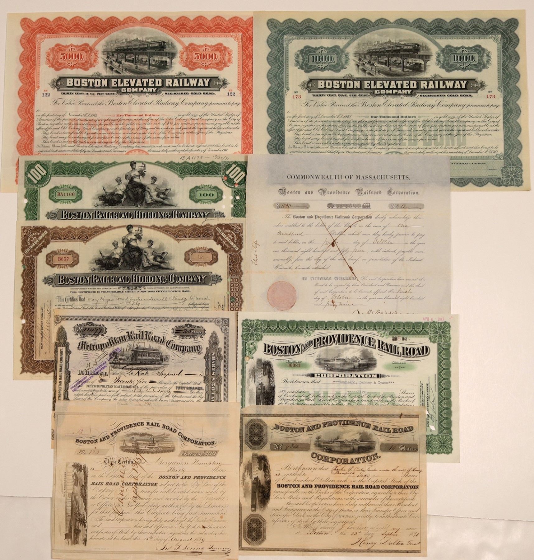 Lot of 9 different. Span a century. 1) Boston Elevated Railway Company. Two unissued bonds, $1,000 and $5,000, 1911-1912. Green or red border, great vignette of elevated railroad in operation with city in the background. ABN. 2) Boston & Providence Railroad Corporation. Four different. Issued 1839 (pen cancelled, paddle steamer vignette), 1841 (not cancelled, train and harbor vignettes),1849 (pen cancelled, no vignettes), and 1943 (punch cancelled, same vignettes). 3) Metropolitan Rail Road Company. Issued in 1886, stamp cancelled. Vignette of horse-drawn streetcar. 4) Boston Railroad Holding Company. Two different, issued in 1913 and 1940, punch cancelled. Allegorical vignette.