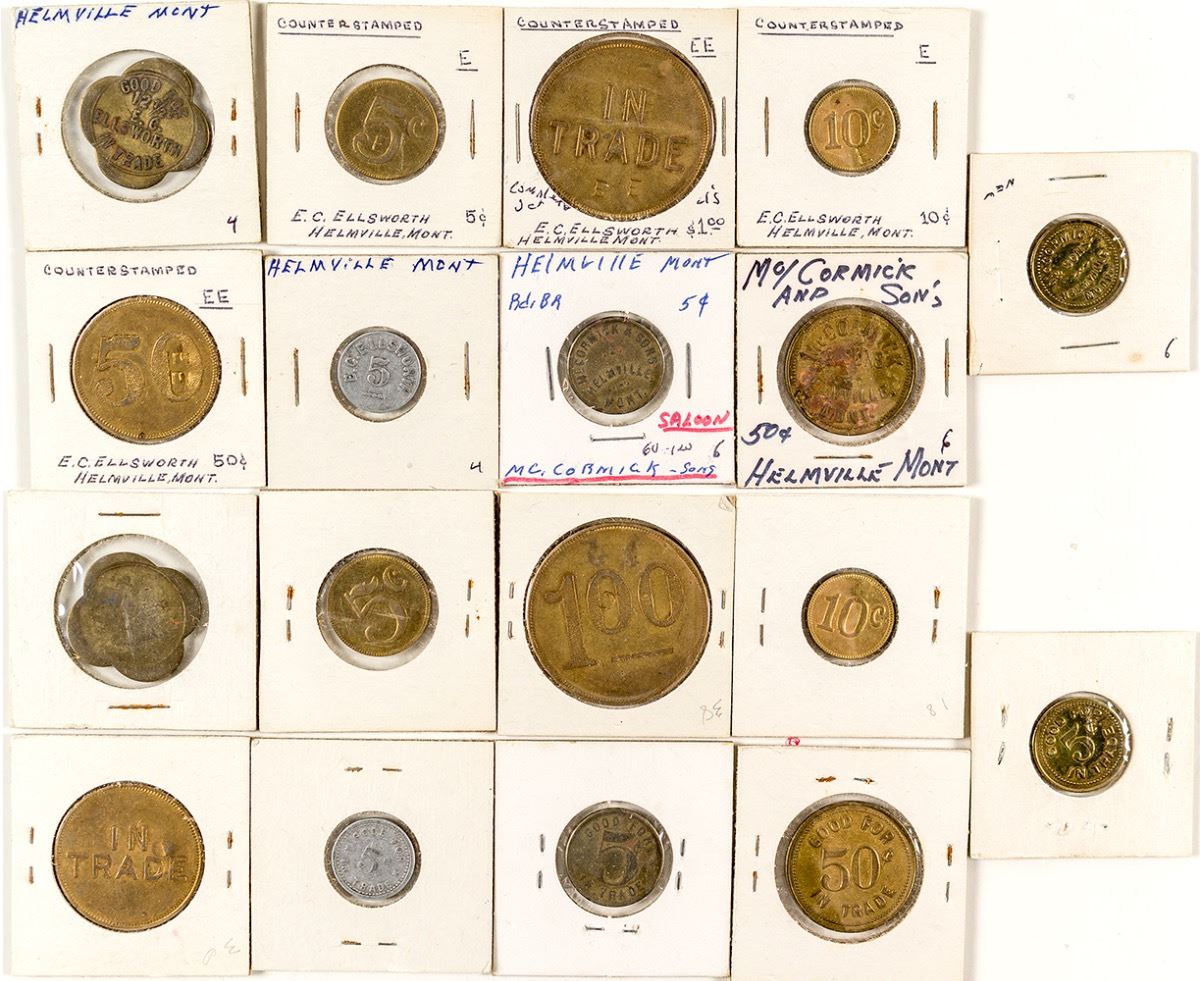 1) Six E. C. Ellsworth / GF / 1- 5c (aluminum). 1- 12 1/2c, scalloped (4) , brass. Four counter-stamped (brass): 5c, 10c, 50c, $1. 2) Three McCormick & Sons / 2-5c and 1 50c. (Svoboda Collection) City: Helmville State: Montana Date: HWAC# 35006