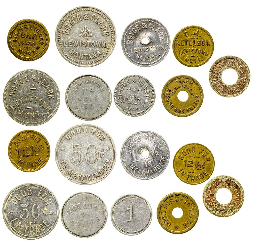 Nine pieces. Three Royce & Clark tokens, 3 Sprinh & Hudson tokens, Smurr & Kirk, Silver Dollar Bar, & C M Ketelson. (Svoboda Collection) City: Lewistown State: Montana Date: HWAC# 35901