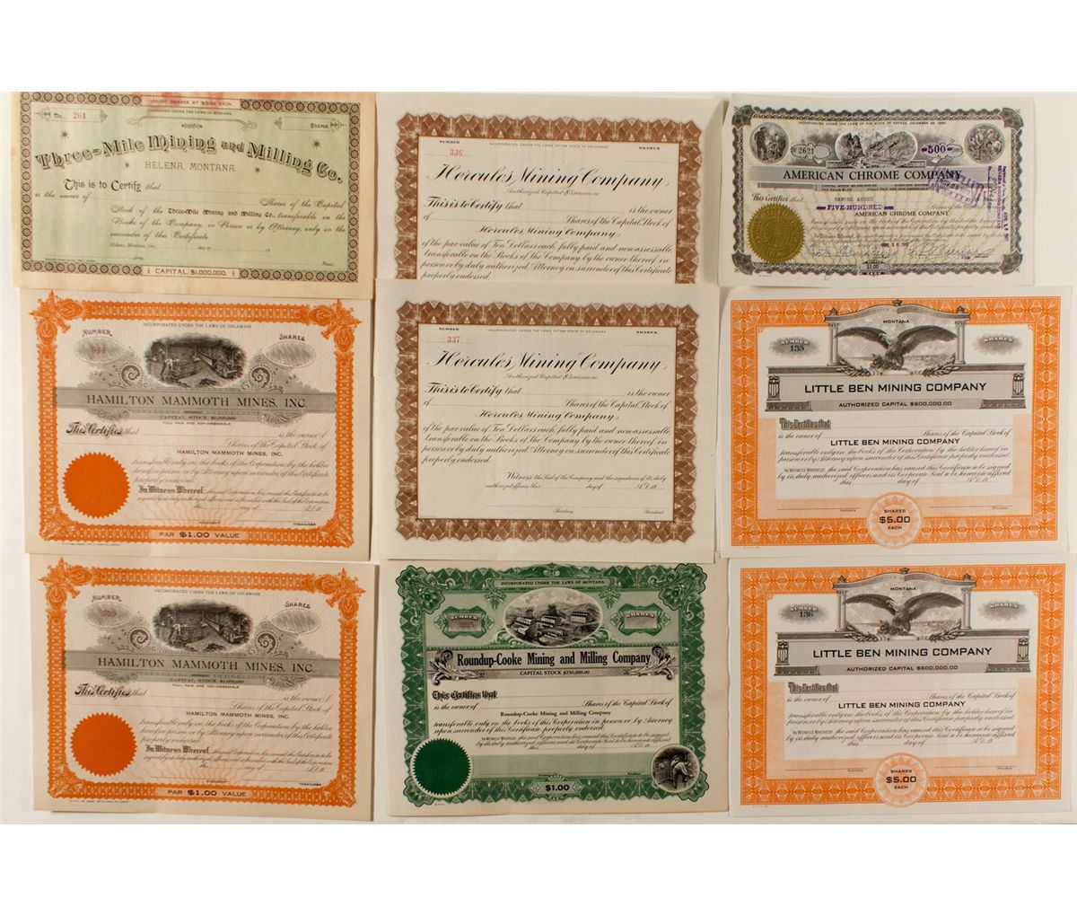 Most with vignettes and clean. (2) Hercules Mining Co. (unissued); (2) Hamilton Mammoth Mines, Inc. (unissued); (2) Little Ben Mining Co. (unissued); American Chrome Co. (issued and cancelled); Roundup-Cooke Mining and Milling Co. (unissued); and Three-mile Mining and Milling Co. (unissued). Please see photo for condition. Date , MT hwac 20229