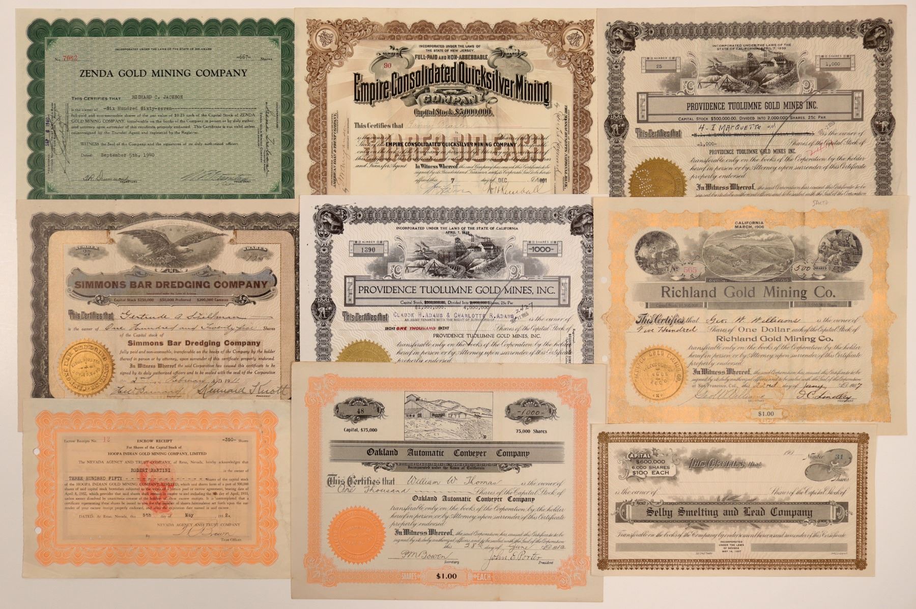 Issued. 1) Empire Consolidated Quicksilver. Lake County. Nice scroll work and underprint. #90 issued in 1901. 2) Zenda Gold Mining Company. Dateline 1940. Kern County. 3) Richland Gold Mining. Incorporated 1900. Sacramento County. Mountain & mining vignettes. 4) Selby Smelting and Lead. 190- Unissued. # 31. Contra Costa County. 5) Oakland Automotive Conveyor Company. Great vignette of the conveyor belt at work at a mine. Number 48. 1912. 6) Hoopa Indian Gold. # 12. 7) Providence Tuolumne Gold Mines, Inc. # 25. 1939. Humboldt County at Willow Creek. Extensive mining vignette. 8) Same company as above. 1952. 9) Simon's Bar Dredging. 1911. Most probably Northern California. City: State: California Date: 1900-1940