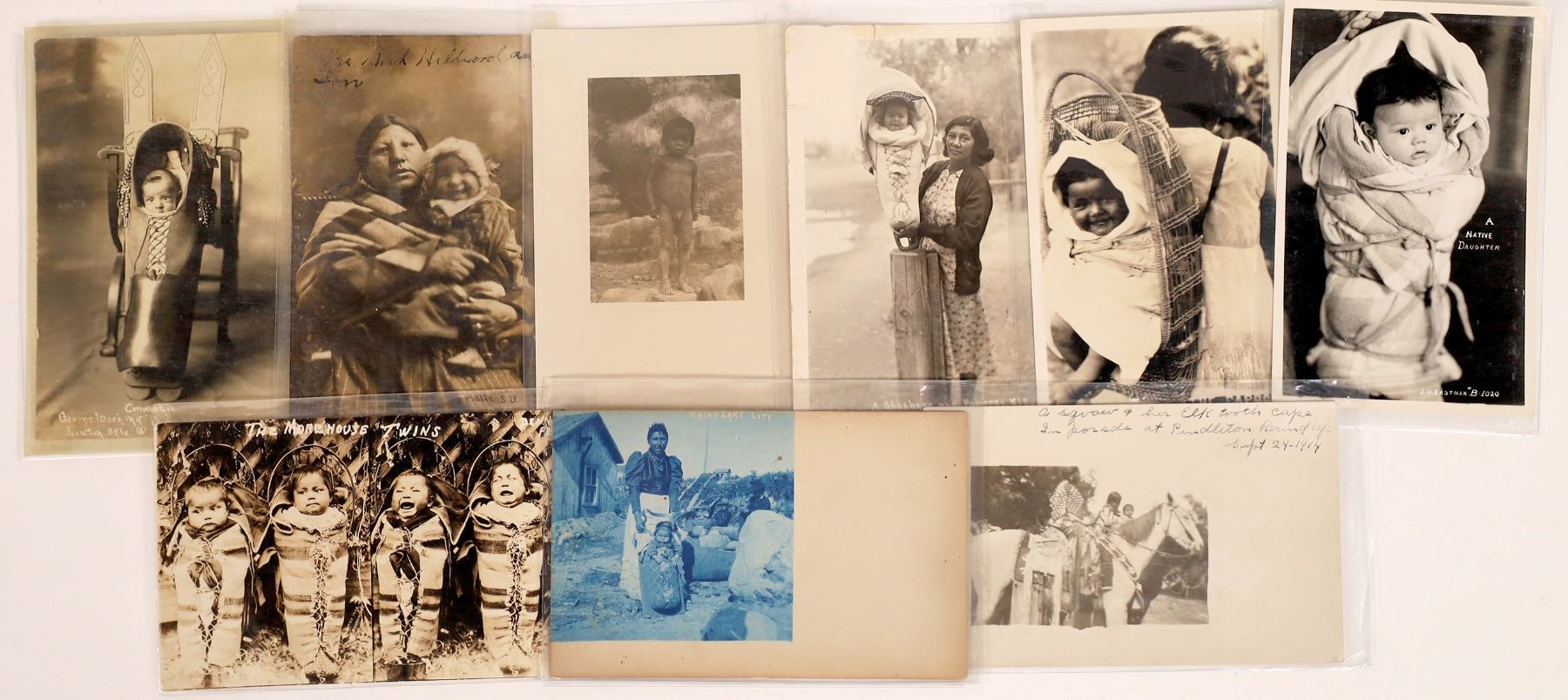 Beautiful RPC'sof American Indian children posed in their cradleboards. While there are a few one shots of the children, other poses include the proud mothers. All are black and white, some blank, some used. Please see photos for more detail and condition.