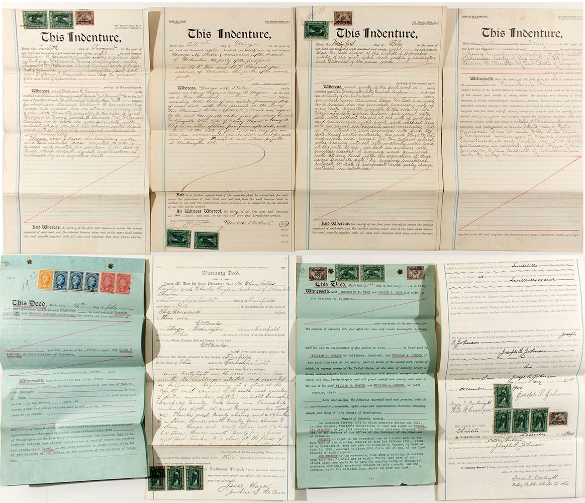 Nine deeds with multiples of R173 varieties (multiples, strips, etc.). Good roulette study! Documents range from 1898-1900.
