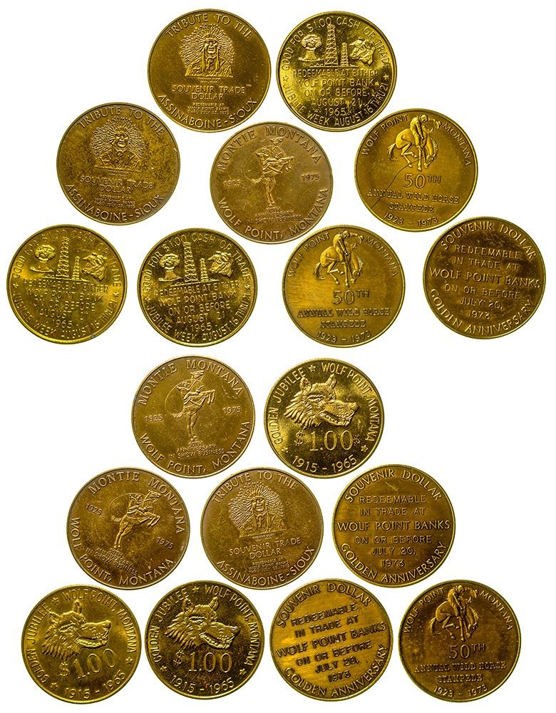 1) Three: Montie Montana, 1925-1975 // Souvenir Trade Dollar. 2) Three: 50th Annual Wild Horse Stampede 1025-1075 // Souvenir Dollar. 3) Three: Golden Jubilee, 1915-1965 // $1.00. (Svoboda Collection) City: Wolf Point State: Montana Date: HWAC# 35865