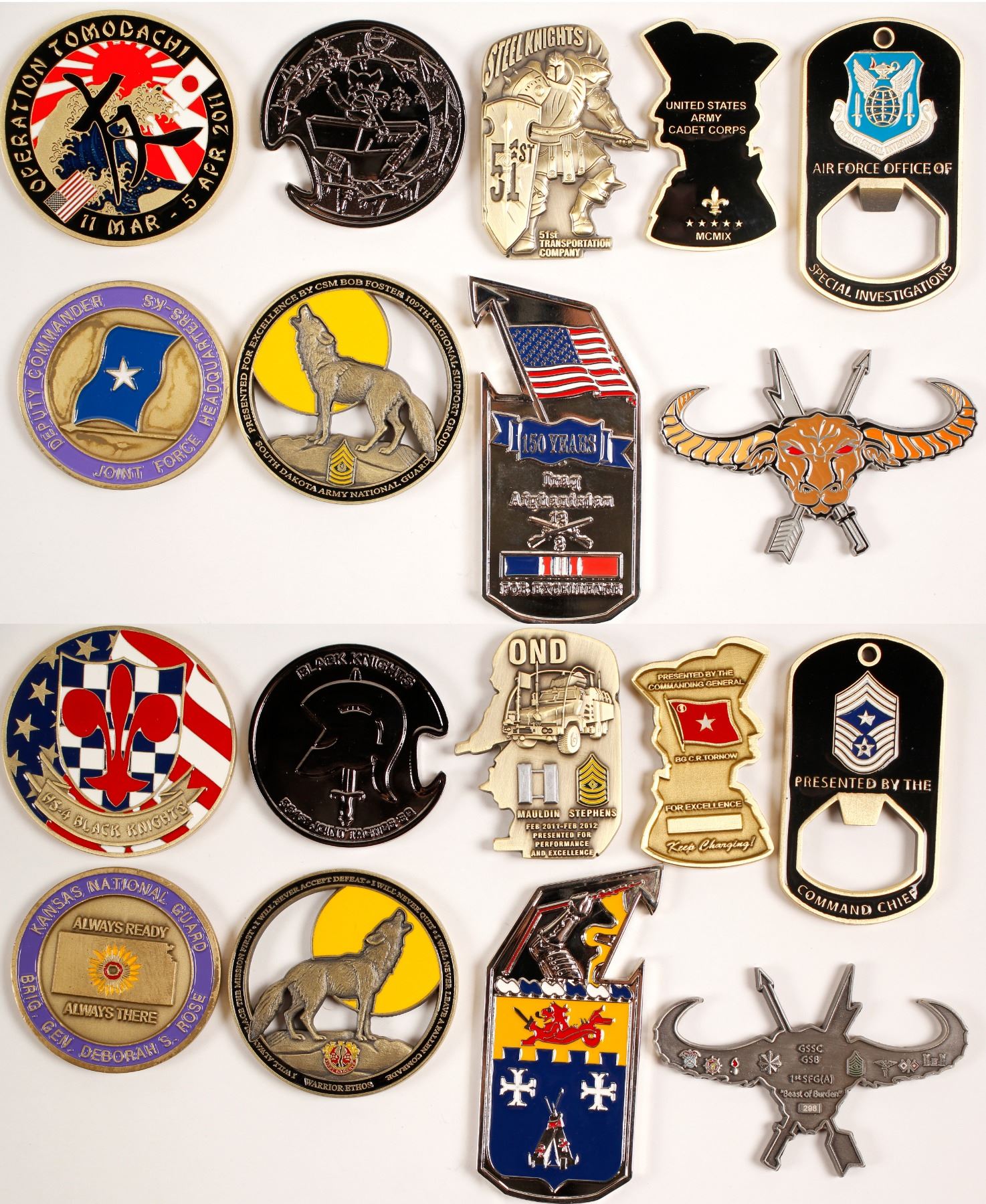 This lot contains nine US ARMY challenge coins in varying designs as shown in the photo. Challenge coins are created to represent the identity of a particular military unit or department, or they may be designed as a token of appreciation and commendation given out by an individual officer. Some of them are even functional as bottle openers. This lot comes from the liquidation of Northwest Territorial Mint. State: City: Date:
