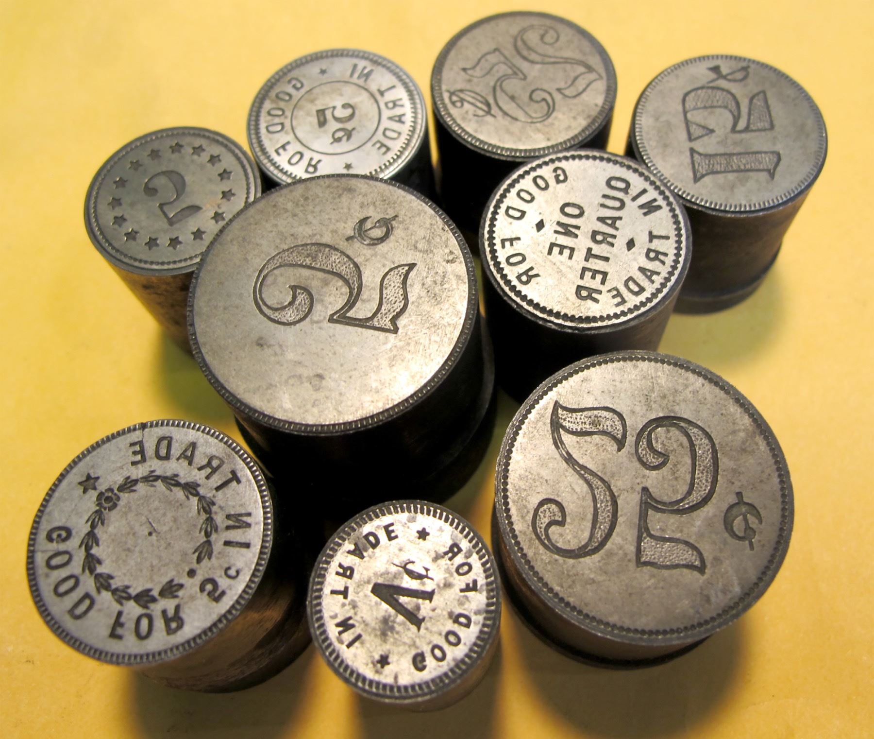 Nine old-style token dies, various amounts, for tokens from an unknown Seattle Die sinker, c 1905-1950 from the NWTM historical die collection. State: City: Date: HWAC# 84655