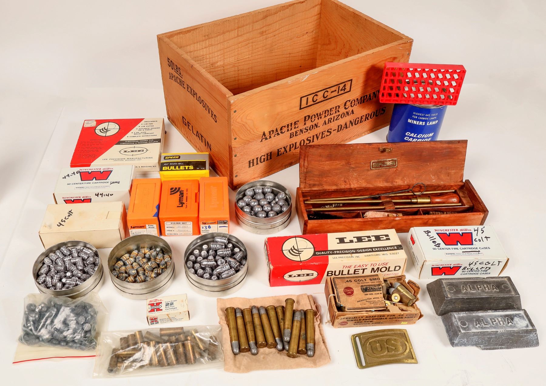 This lot has a large selection of shooting supplies that include Revolutionary War .69 cal. to the .45 Colt cartridge era. The lot has a box marked "50 lbs. Apache Explosives/ Gelatin/ Apache Explosives Company/Benson, Arizona/High Explosives-Dangerous". 11.5 in. X 17 in. X 8 in. In excellent condition. A tin with 50 rounds of .685 round ball (RB), 8 lbs. of Alpha pure lead ingots (2), a tin of 48 rounds of .54 cal. Minie ball for Sharps, 100 rounds of .454 RB made by Speer, a bag with 90 rounds of .45 Colt (round nose lead) with a lubed wide groove at .451 in., a tin of 50 rounds of .44-40 (flat nose) bullets with pre-lubed grease grooves, a tin with 110 rounds of .44-40 (flat nose) bullets without grease measuring at .424 in.. Eleven live rounds of .45-70 original round nose marked "U.M.C. .45-70 S H" cartridges c.1880's, approx. 25 live rounds of .45 Colt in an original .45 Colt Smokeless Box (in poor condition). (The cartridges are presumed to be loaded with black powder), about 25 live rounds of W-W .45 Colt (BP), about 20 count of .44-40 W-W once fired deprimed brass in a bag, about 10 rounds of .45 Colt primed brass, a box of 50 rounds of .44-40 W-W primed (new) brass, a small box of .36 cal. RB and conical lead for the Colt '51 Navy or similar about 40 rounds. Lyman pistol mold for .44-40 FN 205 grain 2 cavity mold NIB, Lyman 310 die set for .45 Colt NIB with instructions, a Lee bullet lubricating & resizing kit for .44 caliber with lube pan no lubricant, a Lee bullet mold with handles for .535 RB mold # 535RB. A box of Western Super X .22 long rifle cartridges 45 count. Explorer shotgun cleaning kit with brushes for 12 gauge. 2 lbs. of Miners Lamp Calcium Carbide (likely used for a signal cannon). No sales to New York, New Jersey, California, Hawaii, or Alaska. Additional shipping charges apply. Live ammunition and combustibles will be shipped separately to minimize hazardous shipping expenses. No international sales. From the Sherman collection. Please see photos for details.