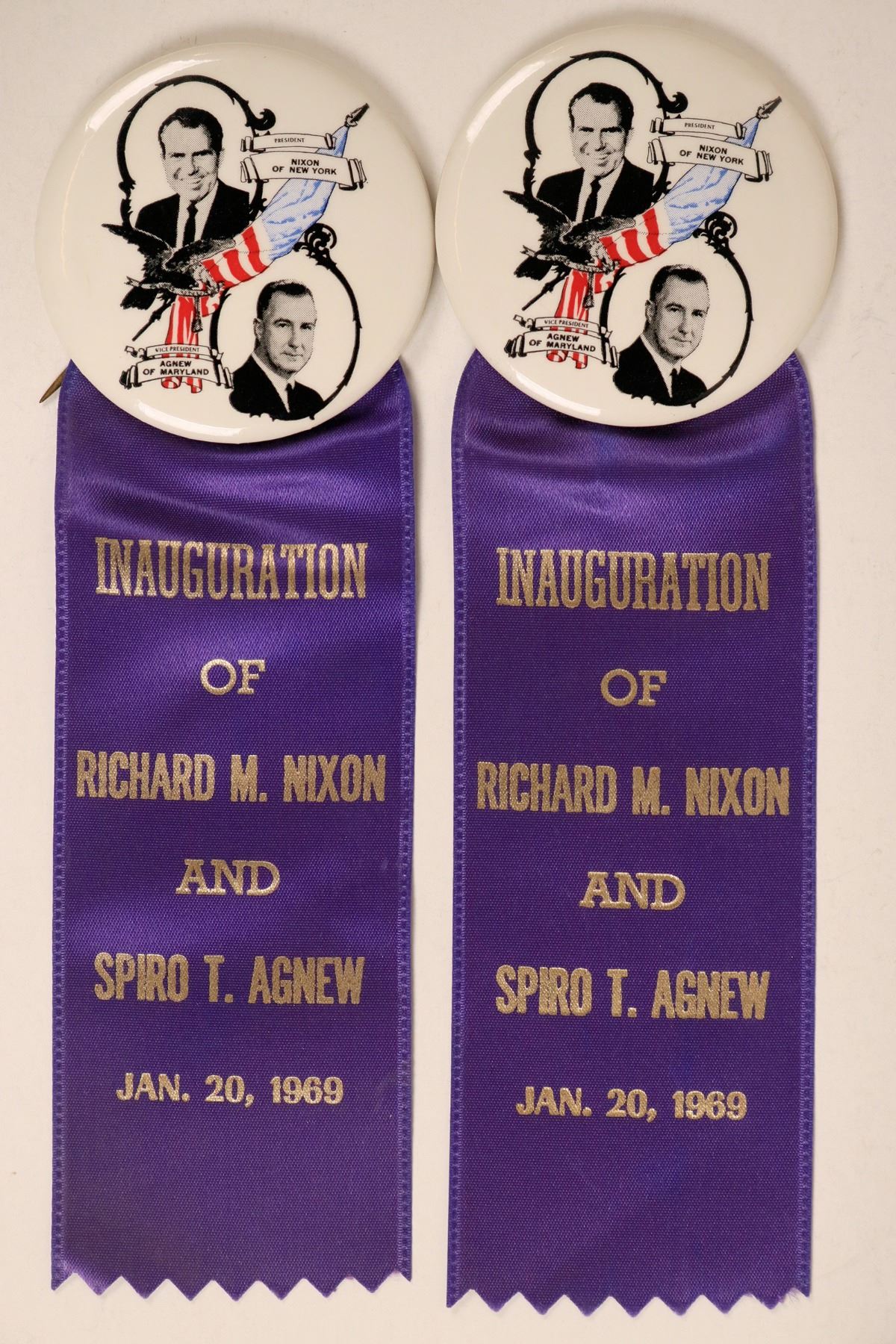Two identical Richard M. Nixon-Spiro T. Agnew inauguration pinbacks with ribbons. Pinbacks feature photos of Nixon and Agnew, are printed with, "President Nixon of New York," and "Vice President Agnew of Maryland," and are 2 1/4 diameter. Dark blue (purplish) ribbons are approx. 2 x 5 inches with silver lettering which reads, "INAUGURATION OF RICHARD M. NIXON AND SPIRO T. AGNEW JAN. 20, 1969. In excellent condition. See photo for more details.
