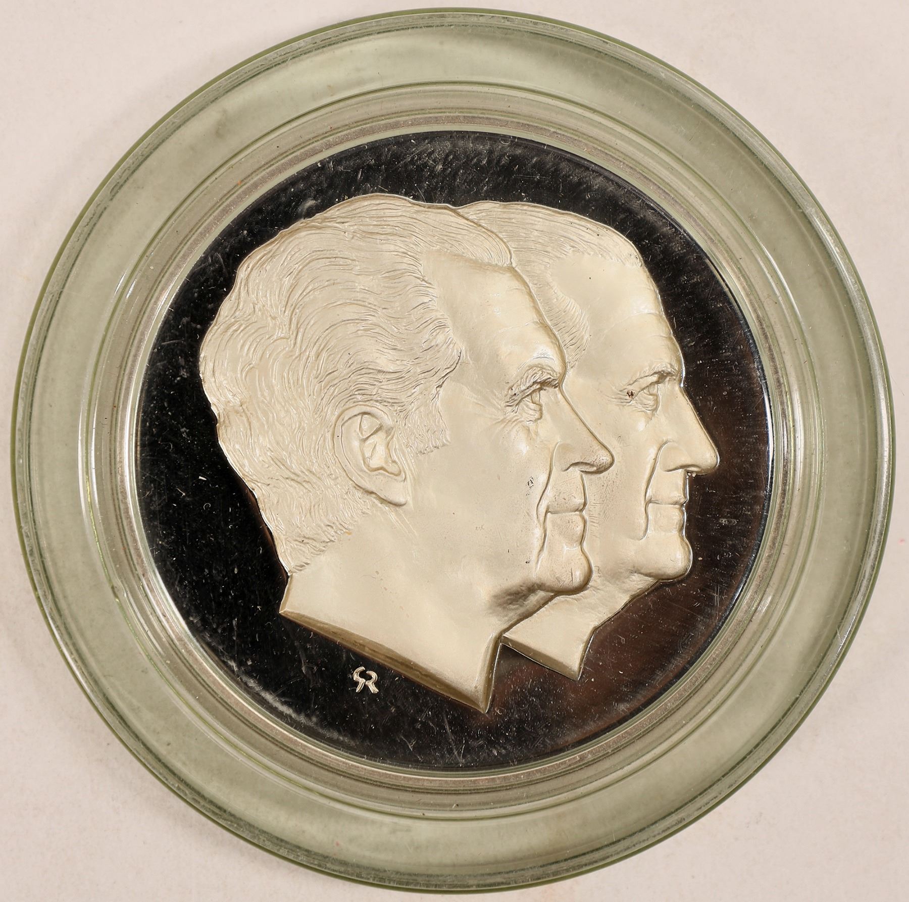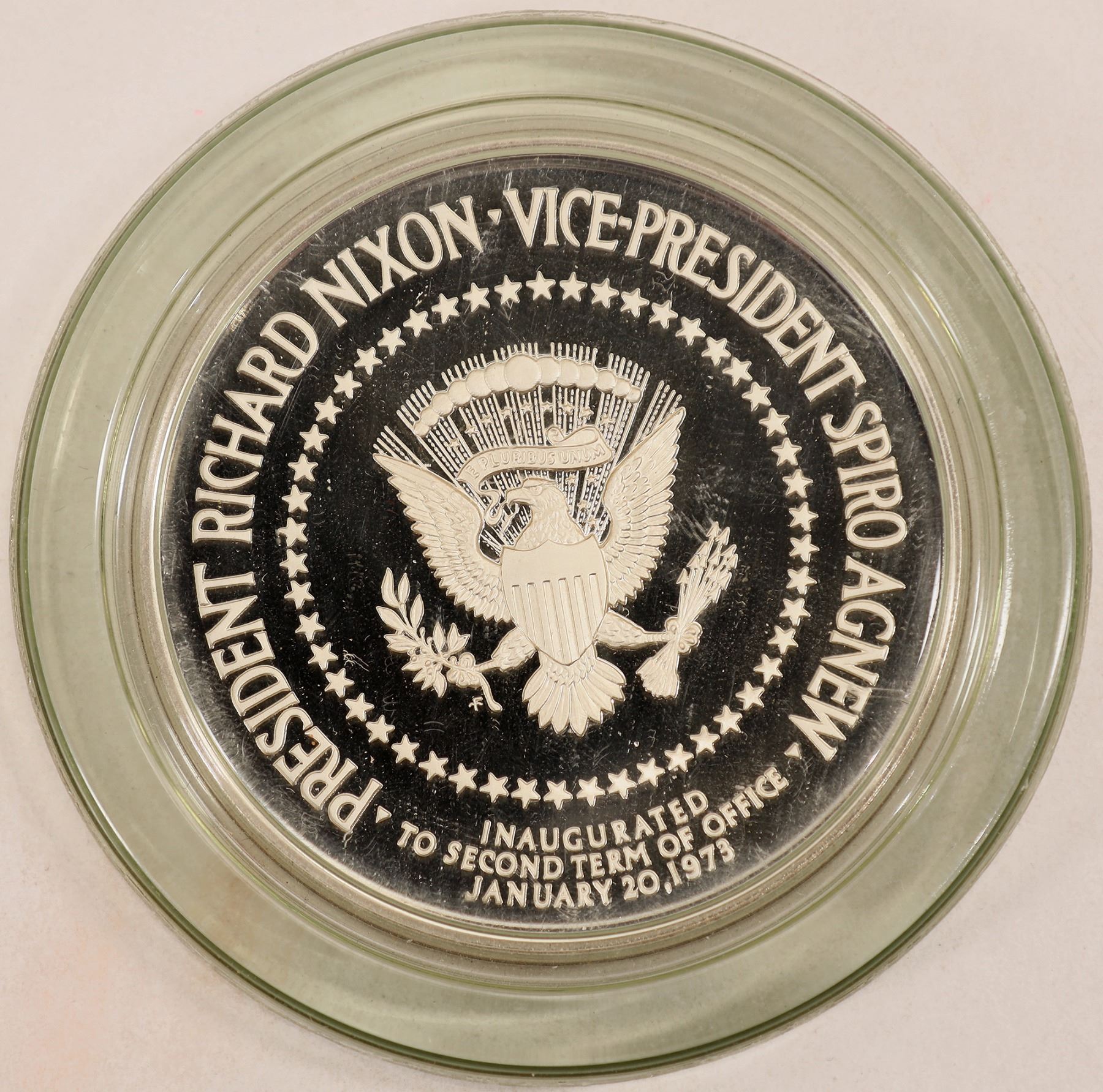 Inaugurated to a second term of office January 10, 1973 President Richard M Nixon and Vice President Spiro Agnew are commemorated on this silver medal. Neither would finish their term in office. Official medal of the inaugural committee. 63 mm; 198 grams. Sterling silver, made by the Franklin Mint. About 6 ounces silver. Salvatore Falcone Collection