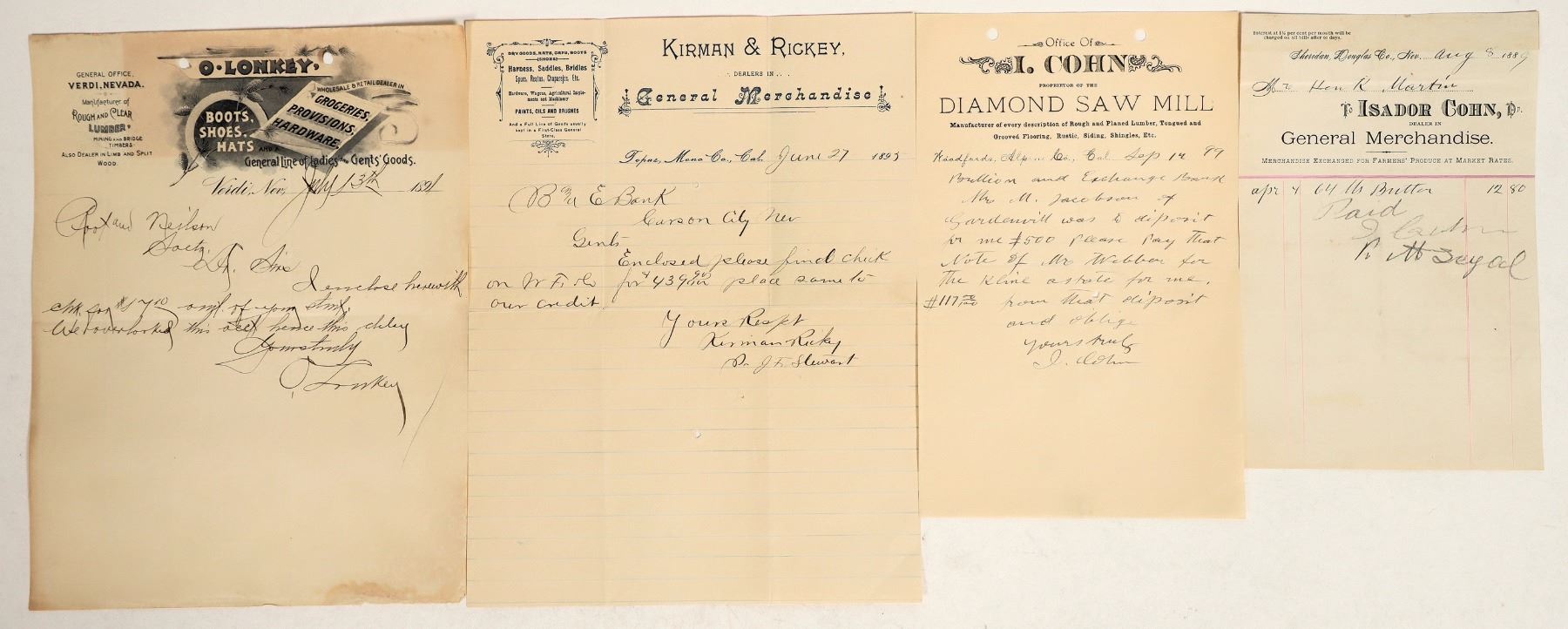 Lot of 4 different for locations that straddle the California/Nevada state line. 1) Isador Cohn, Sheridan, Douglas County, Nevada, 1889. General Merchandise. 2) Different billhead for Cohn's Diamond Saw Mill at nearby Woodfords, Alpine County, California, 1899. 2) Oliver Lonkey, Verdi, Nevada, 1891, Lumber & General Merchandise. He previously operated in Virginia City. 4) Kirman & Rickey, Topaz, Mono County, California 1895. Famous Mono County ranchers.