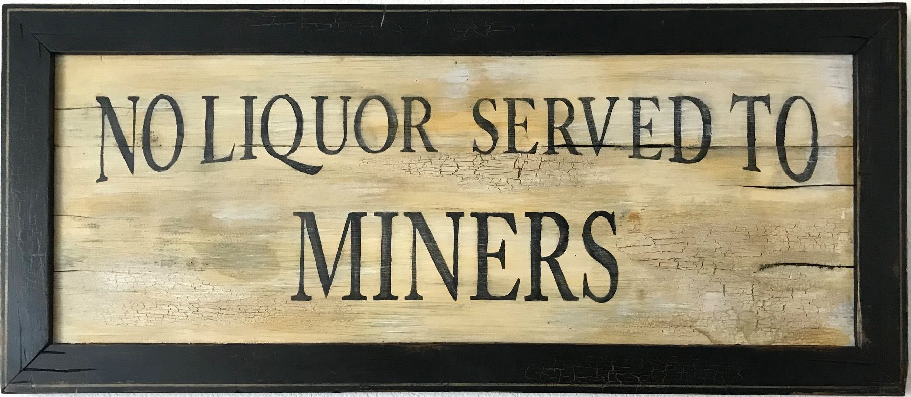Nice wood sign, contemporary construction, reads: "No Liquor Served to Miners". 16" x 37" framed wood, yellow-brown background, black lettering, very attractive. Date: City: State: HWAC# 61303