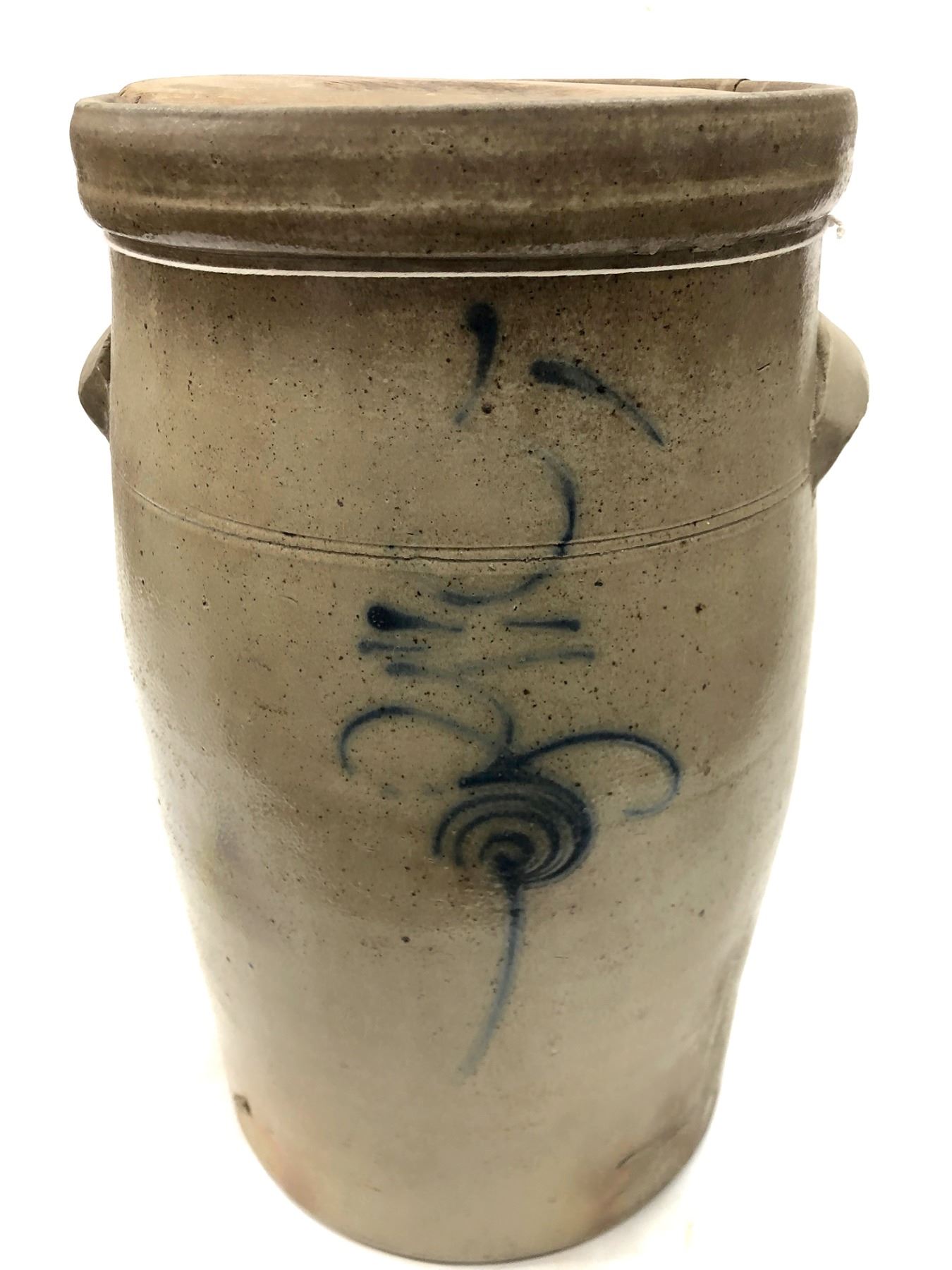 No Name Stoneware Pot with Lid, #5. 17.25 x 9.75". Large crack from the rim to the center. No maker. 2 small rim chips interior. possible flower pictorial in blue.