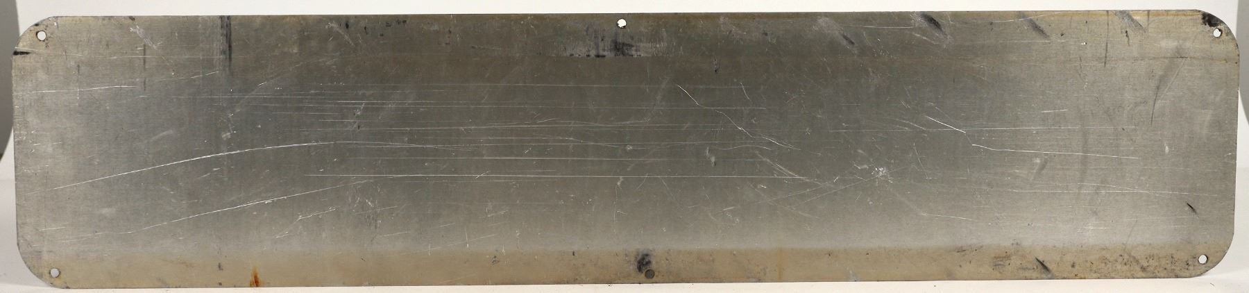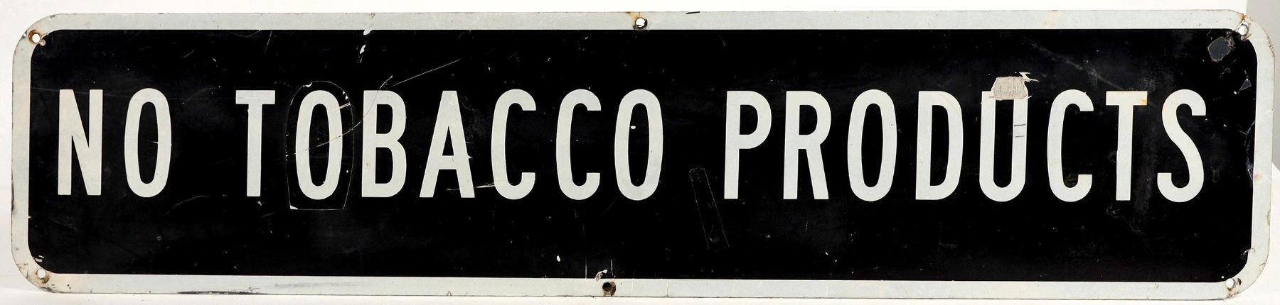 Single sided, No Tobacco Products metal sign. Initially spelled Tabacco, there is an "A" spelling error with a correct "O" covering. 8x36". Wear and surface loss, please inspect.