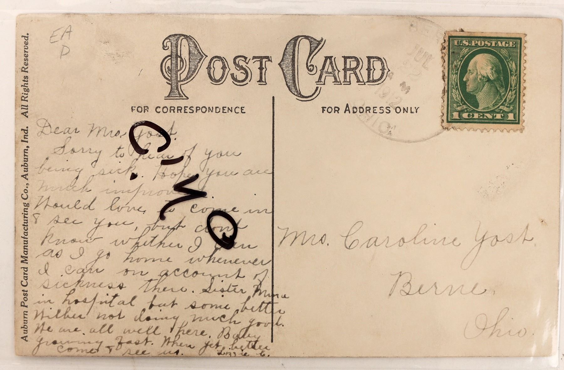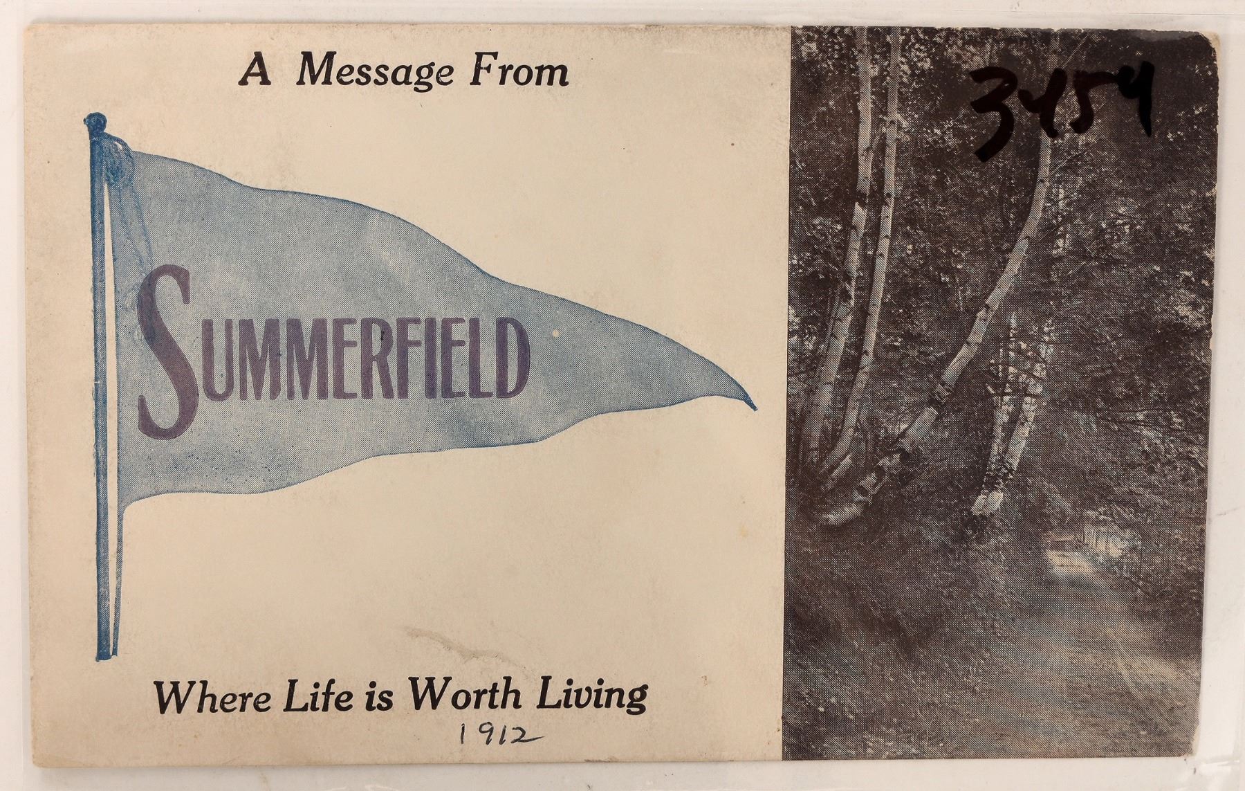 A postcard from Summerfield, Ohio, Noble County, postmark 1912, and stamp. Outdoor scene with printed, "A Message From Summerfield, Where Life is Worth Living."[ Summerfield Ohio
