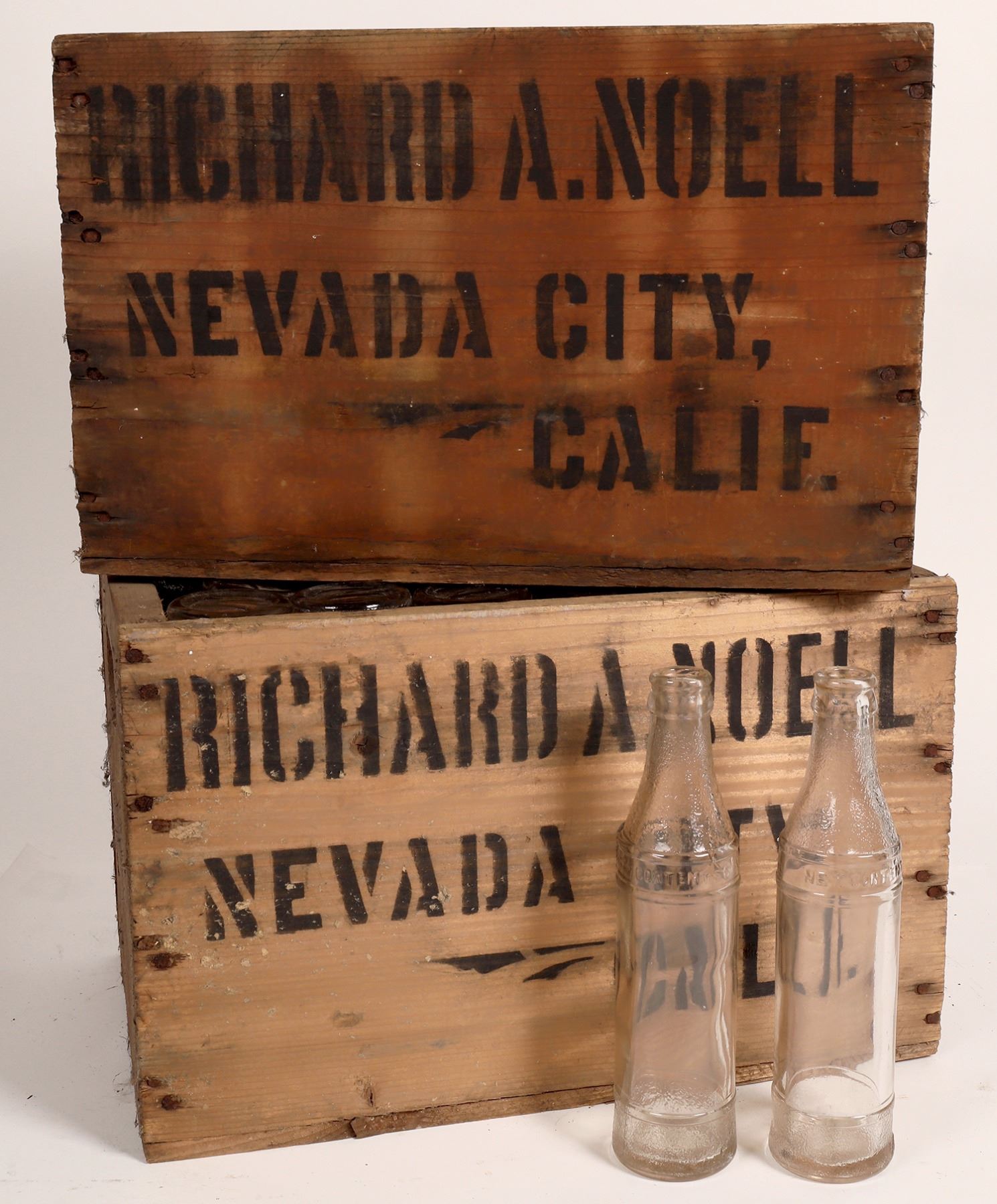 2 original crates of the Noell crowntop of Nevada City. 48 bottles. These bottles are marked with a large N on the base. The crates are marked Richard A Noell/Nevada City/California. These original cases and other similar lots in this sale are from this group, and are offered intact because of the great rarity of original cased soda bottles. Noell took over the soda works from Powell. The bottles of the Nevada City Soda Works remained in the cellar long after Powell's death.
