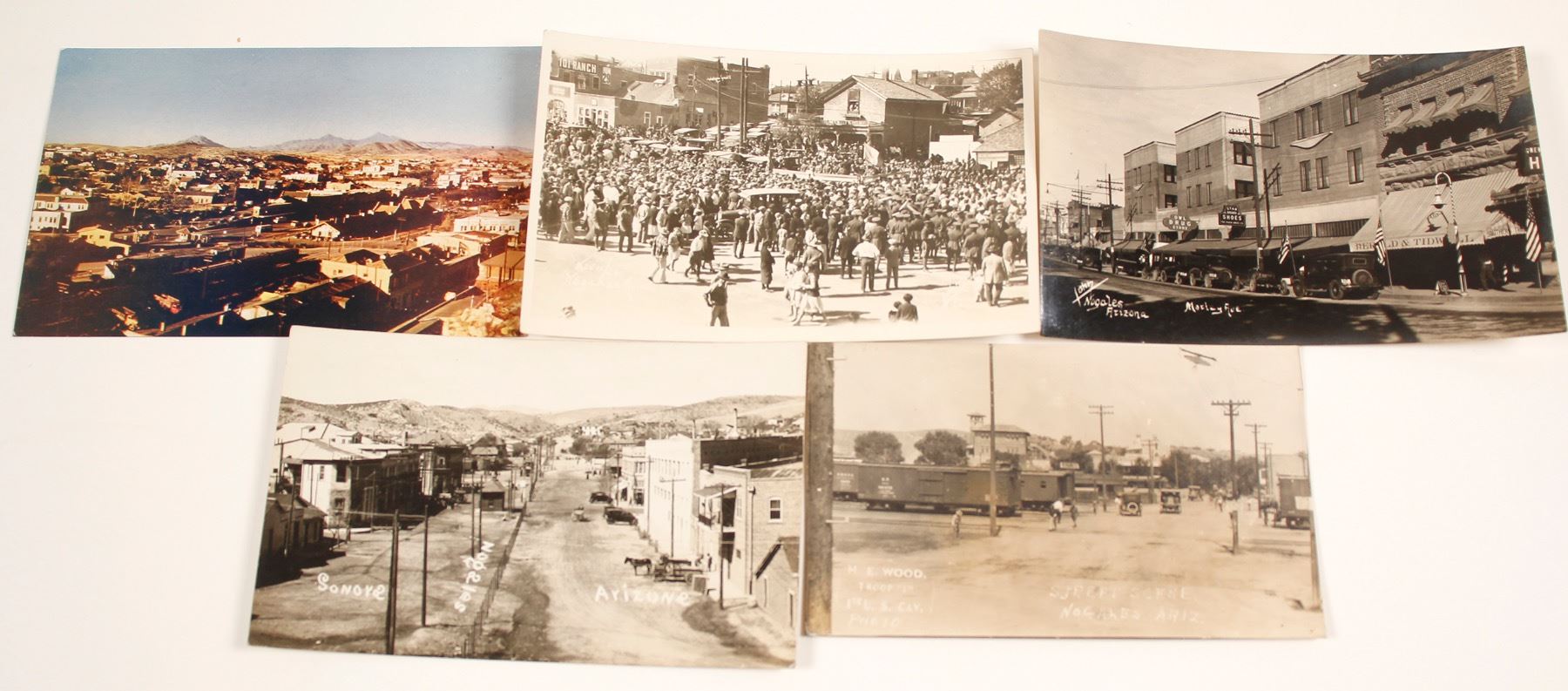 Lot of 5 terrific street scenes from the early years of the town of Nogales. 1) Large crowd gathers in the street. Dated Nov. 11, 1926. No postmark. RPC. Photographer is identified with a watermark on the bottom that reads "John." 2) A view down Morley Ave. No postmark. RPC. Photographer is identified with a watermark on the bottom that reads "John." 3) Street scene. No postmark but there is witting on the back of the postcard. RPC. This photograph was taken by H.E. Wood. Troop "F" 1st. U.S. Cav. 4) Border with U.S. and Mexico. RPC. No photographer identified. 5) Birds eye view color reproduction. From Mike Roberts Kodachrome by Intermountain Tourist Supply Co. Date: Ca. 1926 Location: Nogales, Arizona HWAC# 63815